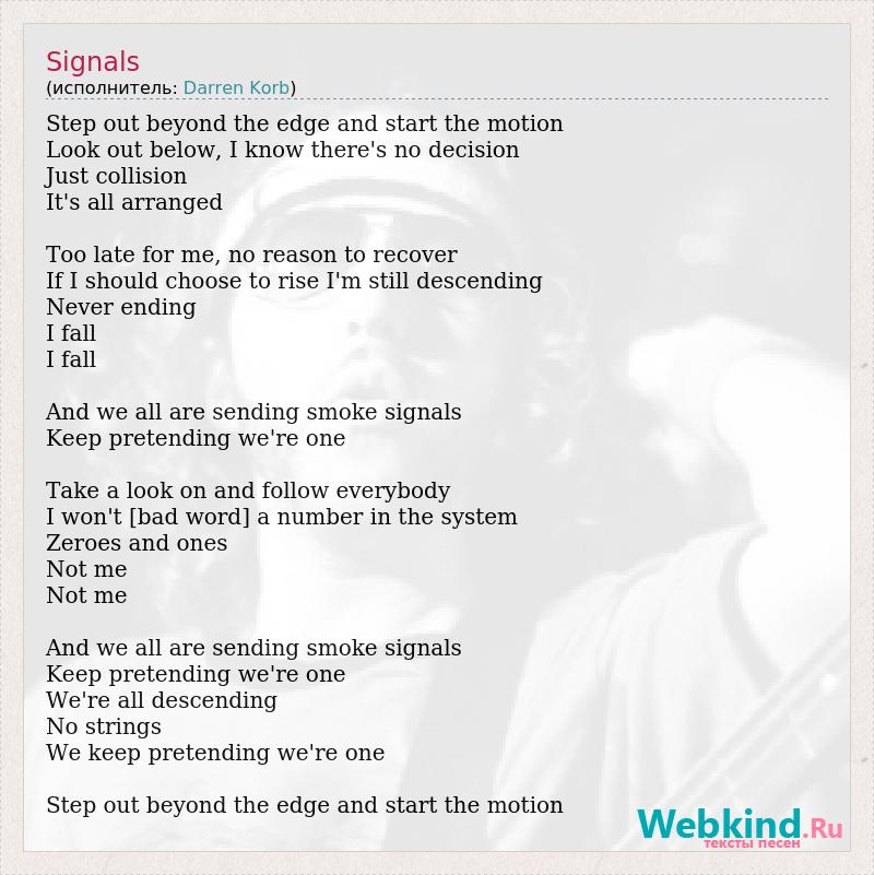 Step out beyond the edge and start the motion Look out below, I know there's no decision Just collision It's all arranged Too late for me, no reason to recover If I should choose to rise I'm still descending Never ending I fall I fall And we all are sending smoke signals Keep pretending we're one Take a look on and follow everybody I won't [bad word] a number in the system Zeroes and ones Not me Not me And we all are sending smoke signals Keep pretending we're one We're all descending No strings We keep pretending we're one Step out beyond the edge and start the motion