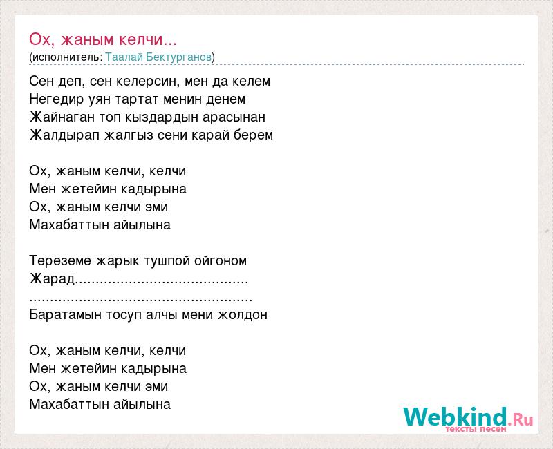 Сен деп, сен келерсин, мен да келем Негедир уян тартат менин денем Жайнаган топ кыздардын арасынан Жалдырап жалгыз сени карай берем Ох, жаным келчи, келчи Мен жетейин кадырына Ох, жаным келчи эми Махабаттын айылына Тереземе жарык тушпой ойгоном Жарад.......................................... ...................................................... Баратамын тосуп алчы мени жолдон Ох, жаным келчи, келчи Мен жетейин кадырына Ох, жаным келчи эми Махабаттын айылына
