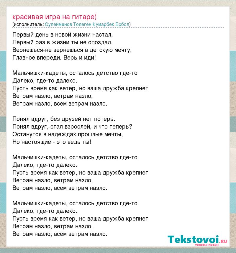 Первый день в новой жизни настал, Первый раз в жизни ты не опоздал. Вернешься-не вернешься в детскую мечту, Главное впереди. Верь и иди! Мальчишки-кадеты, осталось детство где-то Далеко, где-то далеко. Пусть время как ветер, но ваша дружба крепнет Ветрам назло, ветрам назло, Ветрам назло, всем ветрам назло. Понял вдруг, без друзей нет потерь. Понял вдруг, стал взрослей, и что теперь? Останутся в надеждах прошлые мечты, Но настоящие - это ведь ты! Мальчишки-кадеты, осталось детство где-то Далеко, где-то далеко. Пусть время как ветер, но ваша дружба крепнет Ветрам назло, ветрам назло, Ветрам назло, всем ветрам назло. Мальчишки-кадеты, осталось детство где-то Далеко, где-то далеко. Пусть время как ветер, но ваша дружба крепнет Ветрам назло, ветрам назло, Ветрам назло, всем ветрам назло.