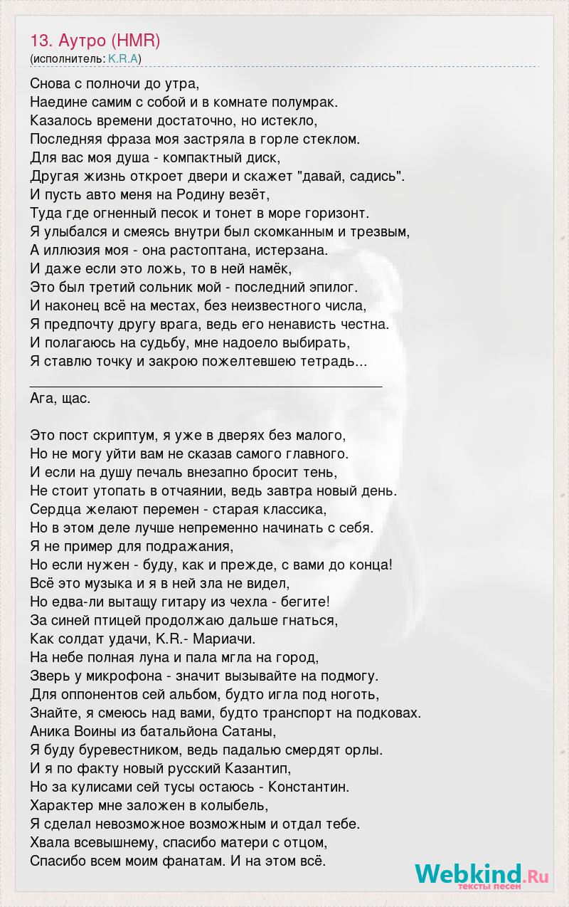 Снова с полночи до утра, Наедине самим с собой и в комнате полумрак. Казалось времени достаточно, но истекло, Последняя фраза моя застряла в горле стеклом. Для вас моя душа - компактный диск, Другая жизнь откроет двери и скажет "давай, садись". И пусть авто меня на Родину везёт, Туда где огненный песок и тонет в море горизонт. Я улыбался и смеясь внутри был скомканным и трезвым, А иллюзия моя - она растоптана, истерзана. И даже если это ложь, то в ней намёк, Это был третий сольник мой - последний эпилог. И наконец всё на местах, без неизвестного числа, Я предпочту другу врага, ведь его ненависть честна. И полагаюсь на судьбу, мне надоело выбирать, Я ставлю точку и закрою пожелтевшею тетрадь... _____________________________________________ Ага, щас. Это пост скриптум, я уже в дверях без малого, Но не могу уйти вам не сказав самого главного. И если на душу печаль внезапно бросит тень, Не стоит утопать в отчаянии, ведь завтра новый день. Сердца желают перемен - старая классика, Но в этом деле лучше непременно начинать с себя. Я не пример для подражания, Но если нужен - буду, как и прежде, с вами до конца! Всё это музыка и я в ней зла не видел, Но едва-ли вытащу гитару из чехла - бегите! За синей птицей продолжаю дальше гнаться, Как солдат удачи, K.R.- Мариачи. На небе полная луна и пала мгла на город, Зверь у микрофона - значит вызывайте на подмогу. Для оппонентов сей альбом, будто игла под ноготь, Знайте, я смеюсь над вами, будто транспорт на подковах. Аника Воины из батальйона Сатаны, Я буду буревестником, ведь падалью смердят орлы. И я по факту новый русский Казантип, Но за кулисами сей тусы остаюсь - Константин. Характер мне заложен в колыбель, Я сделал невозможное возможным и отдал тебе. Хвала всевышнему, спасибо матери с отцом, Спасибо всем моим фанатам. И на этом всё.