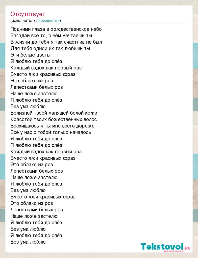 Подними глаза в рождественское небо Загадай всё то, о чём мечтаешь ты В жизни до тебя я так счастлив не был Для тебя одной их так любишь ты Эти белые цветы Я люблю тебя до слёз Каждый вздох как первый раз Вместо лжи красивых фраз Это облако из роз Лепестками белых роз Наше ложе застелю Я люблю тебя до слёз Без ума люблю Белизной твоей манящей белой кожи Красотой твоих божественных волос Восхищаюсь я ты мне всего дороже Всё у нас с тобой только началось Я люблю тебя до слёз Я люблю тебя до слёз Каждый вздох как первый раз Вместо лжи красивых фраз Это облако из роз Лепестками белых роз Наше ложе застелю Я люблю тебя до слёз Без ума люблю Вместо лжи красивых фраз Это облако из роз Лепестками белых роз Наше ложе застелю Я люблю тебя до слёз Без ума люблю Я люблю тебя до слёз Без ума люблю