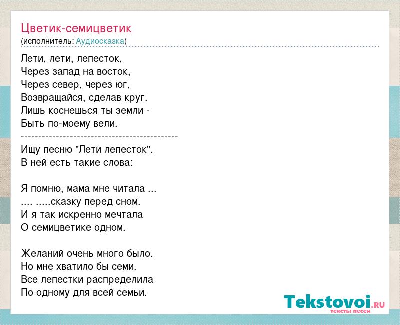 Лети, лети, лепесток, Через запад на восток, Через север, через юг, Возвращайся, сделав круг. Лишь коснешься ты земли - Быть по-моему вели. --------------------------------------------- Ищу песню "Лети лепесток". В ней есть такие слова: Я помню, мама мне читала ... .... .....сказку перед сном. И я так искренно мечтала О семицветике одном. Желаний очень много было. Но мне хватило бы семи. Все лепестки распределила По одному для всей семьи.