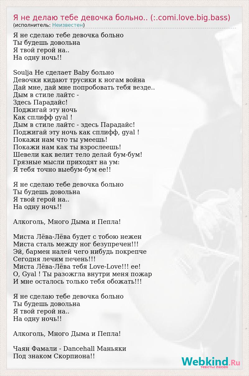 Я не сделаю тебе девочка больно Ты будешь довольна Я твой герой на.. На одну ночь!! Soulja Не сделает Baby больно Девочки кидают трусики к ногам война Дай мне, дай мне попробовать тебя везде.. Дым в стиле лайтс - Здесь Парадайс! Поджигай эту ночь Как сплифф gyal ! Дым в стиле лайтс - здесь Парадайс! Поджигай эту ночь как сплифф, gyal ! Покажи нам что ты умеешь! Покажи нам как ты взрослеешь! Шевели как велит тело делай бум-бум! Грязные мысли приходят на ум: Я тебя точно выебум-бум ее!! Я не сделаю тебе девочка больно Ты будешь довольна Я твой герой на.. На одну ночь!! Алкоголь, Много Дыма и Пепла! Миста Лёва-Лёва будет с тобою нежен Миста сталь между ног безупречен!!! Эй, бармен налей чего нибудь покрепче Сегодня лечим печень!!! Миста Лёва-Лёва тебя Love-Love!!! ее! O, Gyal ! Ты разожгла внутри меня пожар И мне осталось только тебя обожать!!! Я не сделаю тебе девочка больно Ты будешь довольна Я твой герой на.. На одну ночь!! Алкоголь, Много Дыма и Пепла! Чаян Фамали - Dancehall Маньяки Под знаком Скорпиона!!