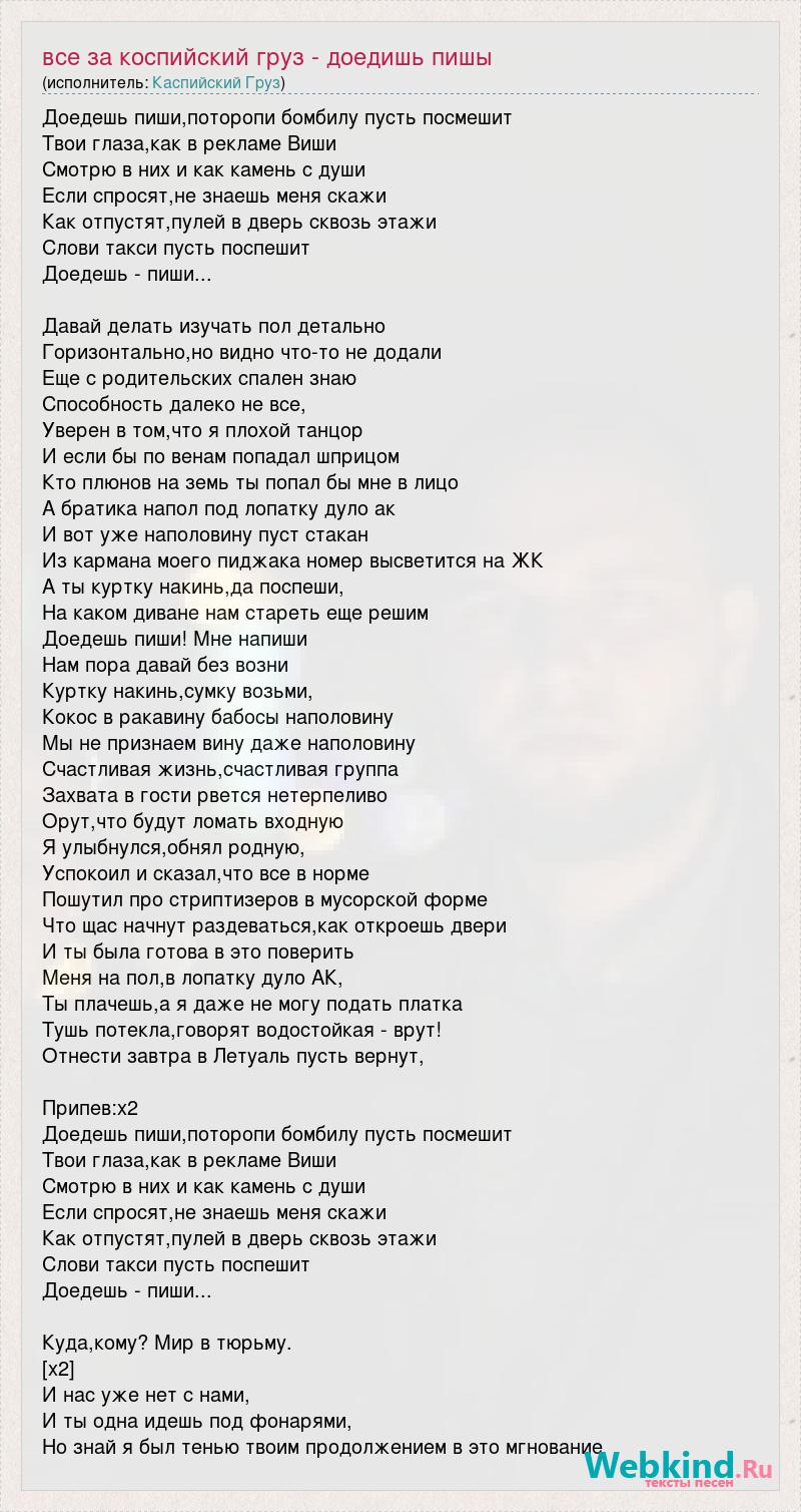 Доедешь пиши,поторопи бомбилу пусть посмешит Твои глаза,как в рекламе Виши Смотрю в них и как камень с души Если спросят,не знаешь меня скажи Как отпустят,пулей в дверь сквозь этажи Слови такси пусть поспешит Доедешь - пиши... Давай делать изучать пол детально Горизонтально,но видно что-то не додали Еще с родительских спален знаю Способность далеко не все, Уверен в том,что я плохой танцор И если бы по венам попадал шприцом Кто плюнов на земь ты попал бы мне в лицо А братика напол под лопатку дуло ак И вот уже наполовину пуст стакан Из кармана моего пиджака номер высветится на ЖК А ты куртку накинь,да поспеши, На каком диване нам стареть еще решим Доедешь пиши! Мне напиши Нам пора давай без возни Куртку накинь,сумку возьми, Кокос в ракавину бабосы наполовину Мы не признаем вину даже наполовину Счастливая жизнь,счастливая группа Захвата в гости рвется нетерпеливо Орут,что будут ломать входную Я улыбнулся,обнял родную, Успокоил и сказал,что все в норме Пошутил про стриптизеров в мусорской форме Что щас начнут раздеваться,как откроешь двери И ты была готова в это поверить Меня на пол,в лопатку дуло АК, Ты плачешь,а я даже не могу подать платка Тушь потекла,говорят водостойкая - врут! Отнести завтра в Летуаль пусть вернут, Припев:х2 Доедешь пиши,поторопи бомбилу пусть посмешит Твои глаза,как в рекламе Виши Смотрю в них и как камень с души Если спросят,не знаешь меня скажи Как отпустят,пулей в дверь сквозь этажи Слови такси пусть поспешит Доедешь - пиши... Куда,кому? Мир в тюрьму. [х2] И нас уже нет с нами, И ты одна идешь под фонарями, Но знай я был тенью твоим продолжением в это мгнование