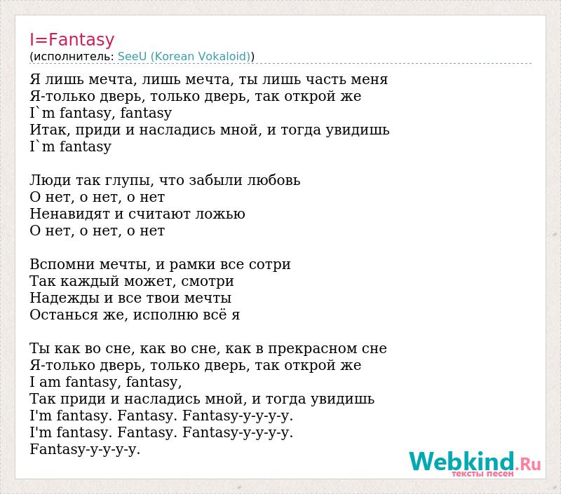 Я лишь мечта, лишь мечта, ты лишь часть меня Я-только дверь, только дверь, так открой же I`m fantasy, fantasy Итак, приди и насладись мной, и тогда увидишь I`m fantasy Люди так глупы, что забыли любовь О нет, о нет, о нет Ненавидят и считают ложью О нет, о нет, о нет Вспомни мечты, и рамки все сотри Так каждый может, смотри Надежды и все твои мечты Останься же, исполню всё я Ты как во сне, как во сне, как в прекрасном сне Я-только дверь, только дверь, так открой же I am fantasy, fantasy, Так приди и насладись мной, и тогда увидишь I'm fantasy. Fantasy. Fantasy-y-y-y-y. I'm fantasy. Fantasy. Fantasy-y-y-y-y. Fantasy-y-y-y-y.