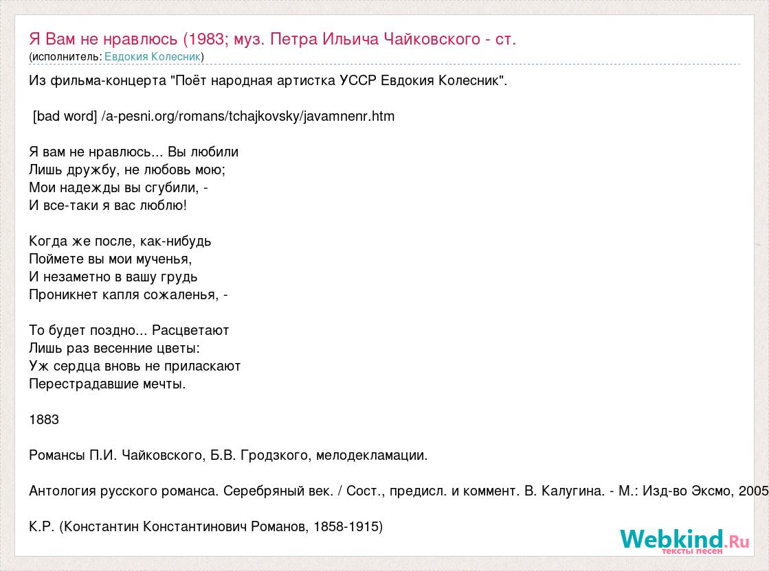 Из фильма-концерта "Поёт народная артистка УССР Евдокия Колесник". [bad word] /a-pesni.org/romans/tchajkovsky/javamnenr.htm Я вам не нравлюсь... Вы любили Лишь дружбу, не любовь мою; Мои надежды вы сгубили, - И все-таки я вас люблю! Когда же после, как-нибудь Поймете вы мои мученья, И незаметно в вашу грудь Проникнет капля сожаленья, - То будет поздно... Расцветают Лишь раз весенние цветы: Уж сердца вновь не приласкают Перестрадавшие мечты. 1883 Романсы П.И. Чайковского, Б.В. Гродзкого, мелодекламации. Антология русского романса. Серебряный век. / Сост., предисл. и коммент. В. Калугина. - М.: Изд-во Эксмо, 2005 К.Р. (Константин Константинович Романов, 1858-1915)