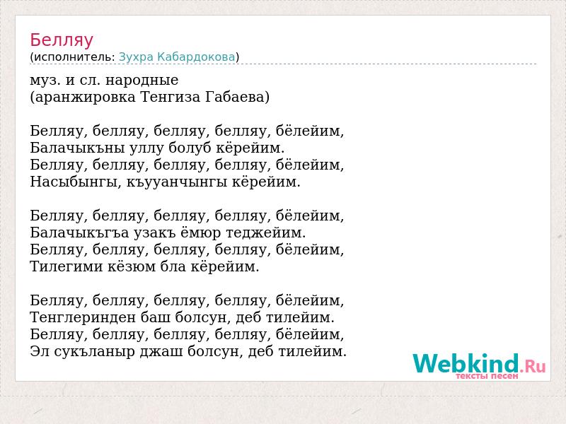 муз. и сл. народные (аранжировка Тенгиза Габаева) Белляу, белляу, белляу, белляу, бёлейим, Балачыкъны уллу болуб кёрейим. Белляу, белляу, белляу, белляу, бёлейим, Насыбынгы, къууанчынгы кёрейим. Белляу, белляу, белляу, белляу, бёлейим, Балачыкъгъа узакъ ёмюр теджейим. Белляу, белляу, белляу, белляу, бёлейим, Тилегими кёзюм бла кёрейим. Белляу, белляу, белляу, белляу, бёлейим, Тенглеринден баш болсун, деб тилейим. Белляу, белляу, белляу, белляу, бёлейим, Эл сукъланыр джаш болсун, деб тилейим.