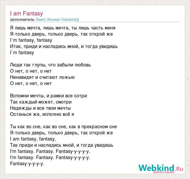 Я лишь мечта, лишь мечта, ты лишь часть меня Я-только дверь, только дверь, так открой же I`m fantasy, fantasy Итак, приди и насладись мной, и тогда увидишь I`m fantasy Люди так глупы, что забыли любовь О нет, о нет, о нет Ненавидят и считают ложью О нет, о нет, о нет Вспомни мечты, и рамки все сотри Так каждый может, смотри Надежды и все твои мечты Останься же, исполню всё я Ты как во сне, как во сне, как в прекрасном сне Я-только дверь, только дверь, так открой же I am fantasy, fantasy, Так приди и насладись мной, и тогда увидишь I'm fantasy. Fantasy. Fantasy-y-y-y-y. I'm fantasy. Fantasy. Fantasy-y-y-y-y. Fantasy-y-y-y-y.