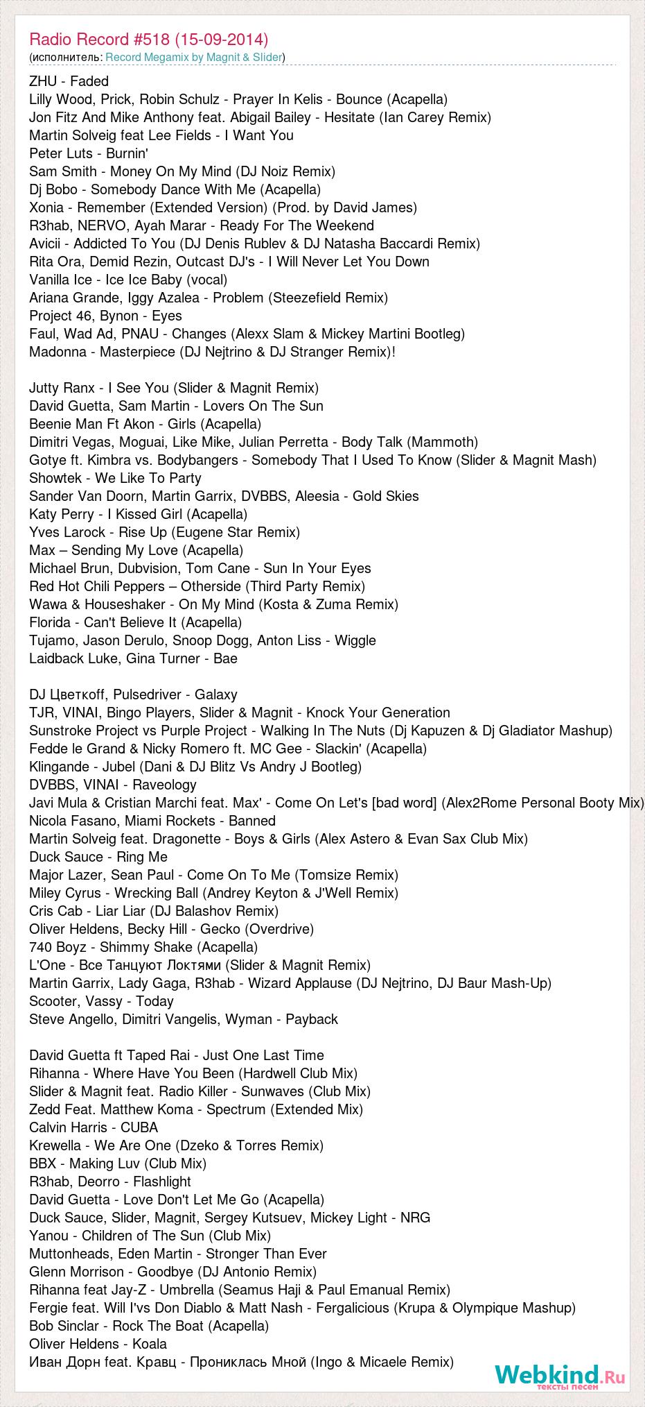 ZHU - Faded Lilly Wood, Prick, Robin Schulz - Prayer In Kelis - Bounce (Acapella) Jon Fitz And Mike Anthony feat. Abigail Bailey - Hesitate (Ian Carey Remix) Martin Solveig feat Lee Fields - I Want You Peter Luts - Burnin' Sam Smith - Money On My Mind (DJ Noiz Remix) Dj Bobo - Somebody Dance With Me (Acapella) Xonia - Remember (Extended Version) (Prod. by David James) R3hab, NERVO, Ayah Marar - Ready For The Weekend Avicii - Addicted To You (DJ Denis Rublev & DJ Natasha Baccardi Remix) Rita Ora, Demid Rezin, Outcast DJ's - I Will Never Let You Down Vanilla Ice - Ice Ice Baby (vocal) Ariana Grande, Iggy Azalea - Problem (Steezefield Remix) Project 46, Bynon - Eyes Faul, Wad Ad, PNAU - Changes (Alexx Slam & Mickey Martini Bootleg) Madonna - Masterpiece (DJ Nejtrino & DJ Stranger Remix)! Jutty Ranx - I See You (Slider & Magnit Remix) David Guetta, Sam Martin - Lovers On The Sun Beenie Man Ft Akon - Girls (Acapella) Dimitri Vegas, Moguai, Like Mike, Julian Perretta - Body Talk (Mammoth) Gotye ft. Kimbra vs. Bodybangers - Somebody That I Used To Know (Slider & Magnit Mash) Showtek - We Like To Party Sander Van Doorn, Martin Garrix, DVBBS, Aleesia - Gold Skies Katy Perry - I Kissed Girl (Acapella) Yves Larock - Rise Up (Eugene Star Remix) Max – Sending My Love (Acapella) Michael Brun, Dubvision, Tom Cane - Sun In Your Eyes Red Hot Chili Peppers – Otherside (Third Party Remix) Wawa & Houseshaker - On My Mind (Kosta & Zuma Remix) Florida - Can't Believe It (Acapella) Tujamo, Jason Derulo, Snoop Dogg, Anton Liss - Wiggle Laidback Luke, Gina Turner - Bae DJ Цветкоff, Pulsedriver - Galaxy TJR, VINAI, Bingo Players, Slider & Magnit - Knock Your Generation Sunstroke Project vs Purple Project - Walking In The Nuts (Dj Kapuzen & Dj Gladiator Mashup) Fedde le Grand & Nicky Romero ft. MC Gee - Slackin' (Acapella) Klingande - Jubel (Dani & DJ Blitz Vs Andry J Bootleg) DVBBS, VINAI - Raveology Javi Mula & Cristian Marchi feat. Max' - Come On Let's [bad word] (Alex2Rome Personal Booty Mix) Nicola Fasano, Miami Rockets - Banned Martin Solveig feat. Dragonette - Boys & Girls (Alex Astero & Evan Sax Club Mix) Duck Sauce - Ring Me Major Lazer, Sean Paul - Come On To Me (Tomsize Remix) Miley Cyrus - Wrecking Ball (Andrey Keyton & J'Well Remix) Cris Cab - Liar Liar (DJ Balashov Remix) Oliver Heldens, Becky Hill - Gecko (Overdrive) 740 Boyz - Shimmy Shake (Acapella) L'One - Все Танцуют Локтями (Slider & Magnit Remix) Martin Garrix, Lady Gaga, R3hab - Wizard Applause (DJ Nejtrino, DJ Baur Mash-Up) Scooter, Vassy - Today Steve Angello, Dimitri Vangelis, Wyman - Payback David Guetta ft Taped Rai - Just One Last Time Rihanna - Where Have You Been (Hardwell Club Mix) Slider & Magnit feat. Radio Killer - Sunwaves (Club Mix) Zedd Feat. Matthew Koma - Spectrum (Extended Mix) Calvin Harris - CUBA Krewella - We Are One (Dzeko & Torres Remix) BBX - Making Luv (Club Mix) R3hab, Deorro - Flashlight David Guetta - Love Don't Let Me Go (Acapella) Duck Sauce, Slider, Magnit, Sergey Kutsuev, Mickey Light - NRG Yanou - Children of The Sun (Club Mix) Muttonheads, Eden Martin - Stronger Than Ever Glenn Morrison - Goodbye (DJ Antonio Remix) Rihanna feat Jay-Z - Umbrella (Seamus Haji & Paul Emanual Remix) Fergie feat. Will I'vs Don Diablo & Matt Nash - Fergalicious (Krupa & Olympique Mashup) Bob Sinclar - Rock The Boat (Acapella) Oliver Heldens - Koala Иван Дорн feat. Кравц - Прониклась Мной (Ingo & Micaele Remix)