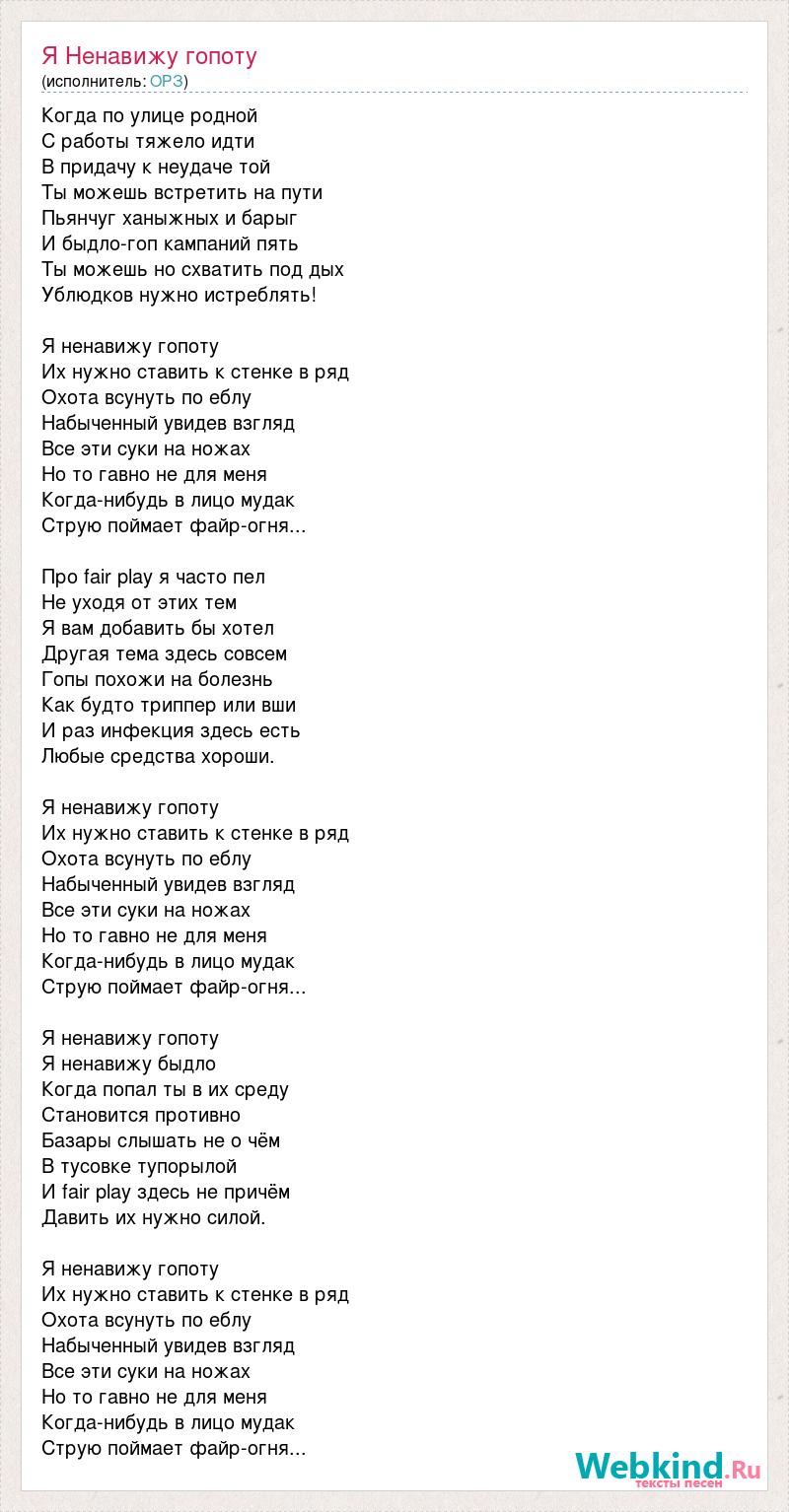 Когда по улице родной С работы тяжело идти В придачу к неудаче той Ты можешь встретить на пути Пьянчуг ханыжных и барыг И быдло-гоп кампаний пять Ты можешь но схватить под дых Ублюдков нужно истреблять! Я ненавижу гопоту Их нужно ставить к стенке в ряд Охота всунуть по еблу Набыченный увидев взгляд Все эти суки на ножах Но то гавно не для меня Когда-нибудь в лицо мудак Струю поймает файр-огня... Про fair play я часто пел Не уходя от этих тем Я вам добавить бы хотел Другая тема здесь совсем Гопы похожи на болезнь Как будто триппер или вши И раз инфекция здесь есть Любые средства хороши. Я ненавижу гопоту Их нужно ставить к стенке в ряд Охота всунуть по еблу Набыченный увидев взгляд Все эти суки на ножах Но то гавно не для меня Когда-нибудь в лицо мудак Струю поймает файр-огня... Я ненавижу гопоту Я ненавижу быдло Когда попал ты в их среду Становится противно Базары слышать не о чём В тусовке тупорылой И fair play здесь не причём Давить их нужно силой. Я ненавижу гопоту Их нужно ставить к стенке в ряд Охота всунуть по еблу Набыченный увидев взгляд Все эти суки на ножах Но то гавно не для меня Когда-нибудь в лицо мудак Струю поймает файр-огня...