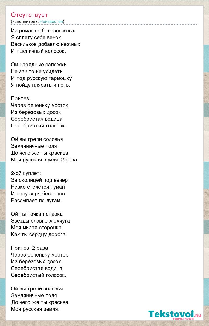 Из ромашек белоснежных Я сплету себе венок Васильков добавлю нежных И пшеничный колосок. Ой нарядные сапожки Не за что не усидеть И под русскую гармошку Я пойду плясать и петь. Припев: Через реченьку мосток Из берёзовых досок Серебристая водица Серебристый голосок. Ой вы трели соловья Земляничные поля До чего же ты красива Моя русская земля. 2 раза 2-ой куплет: За околицей под вечер Низко стелется туман И расу зоря беспечно Рассыпает по лугам. Ой ты ночка ненаока Звезды словно жемчуга Моя милая сторонка Как ты сердцу дорога. Припев: 2 раза Через реченьку мосток Из берёзовых досок Серебристая водица Серебристый голосок. Ой вы трели соловья Земляничные поля До чего же ты красива Моя русская земля.