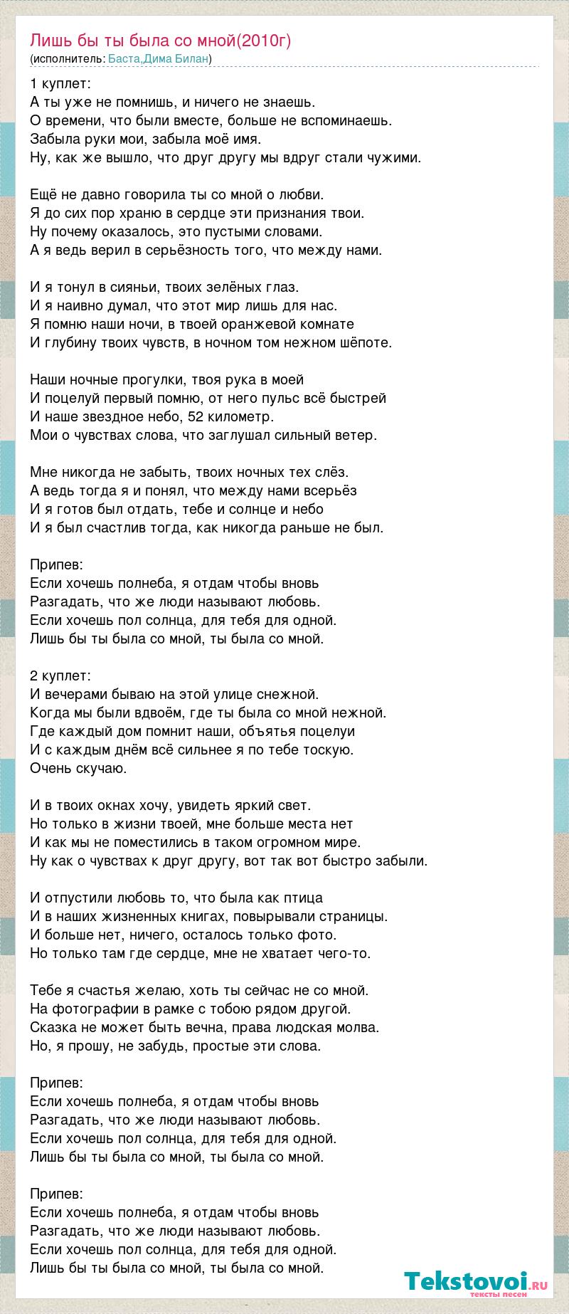 1 куплет: А ты уже не помнишь, и ничего не знаешь. О времени, что были вместе, больше не вспоминаешь. Забыла руки мои, забыла моё имя. Ну, как же вышло, что друг другу мы вдруг стали чужими. Ещё не давно говорила ты со мной о любви. Я до сих пор храню в сердце эти признания твои. Ну почему оказалось, это пустыми словами. А я ведь верил в серьёзность того, что между нами. И я тонул в сияньи, твоих зелёных глаз. И я наивно думал, что этот мир лишь для нас. Я помню наши ночи, в твоей оранжевой комнате И глубину твоих чувств, в ночном том нежном шёпоте. Наши ночные прогулки, твоя рука в моей И поцелуй первый помню, от него пульс всё быстрей И наше звездное небо, 52 километр. Мои о чувствах слова, что заглушал сильный ветер. Мне никогда не забыть, твоих ночных тех слёз. А ведь тогда я и понял, что между нами всерьёз И я готов был отдать, тебе и солнце и небо И я был счастлив тогда, как никогда раньше не был. Припев: Если хочешь полнеба, я отдам чтобы вновь Разгадать, что же люди называют любовь. Если хочешь пол солнца, для тебя для одной. Лишь бы ты была со мной, ты была со мной. 2 куплет: И вечерами бываю на этой улице снежной. Когда мы были вдвоём, где ты была со мной нежной. Где каждый дом помнит наши, объятья поцелуи И с каждым днём всё сильнее я по тебе тоскую. Очень скучаю. И в твоих окнах хочу, увидеть яркий свет. Но только в жизни твоей, мне больше места нет И как мы не поместились в таком огромном мире. Ну как о чувствах к друг другу, вот так вот быстро забыли. И отпустили любовь то, что была как птица И в наших жизненных книгах, повырывали страницы. И больше нет, ничего, осталось только фото. Но только там где сердце, мне не хватает чего-то. Тебе я счастья желаю, хоть ты сейчас не со мной. На фотографии в рамке с тобою рядом другой. Сказка не может быть вечна, права людская молва. Но, я прошу, не забудь, простые эти слова. Припев: Если хочешь полнеба, я отдам чтобы вновь Разгадать, что же люди называют любовь. Если хочешь пол солнца, для тебя для одной. Лишь бы ты была со мной, ты была со мной. Припев: Если хочешь полнеба, я отдам чтобы вновь Разгадать, что же люди называют любовь. Если хочешь пол солнца, для тебя для одной. Лишь бы ты была со мной, ты была со мной.