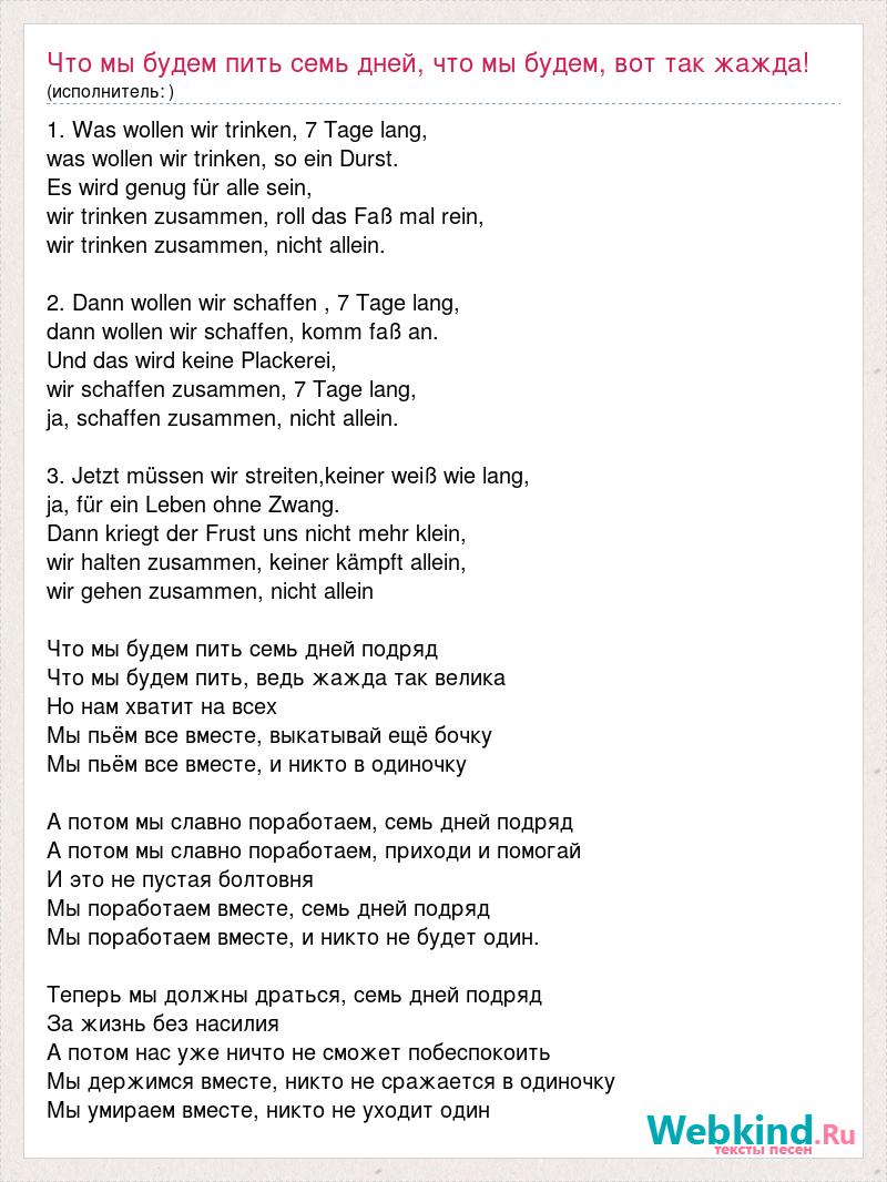 1. Was wollen wir trinken, 7 Tage lang, was wollen wir trinken, so ein Durst. Es wird genug für alle sein, wir trinken zusammen, roll das Faß mal rein, wir trinken zusammen, nicht allein. 2. Dann wollen wir schaffen , 7 Tage lang, dann wollen wir schaffen, komm faß an. Und das wird keine Plackerei, wir schaffen zusammen, 7 Tage lang, ja, schaffen zusammen, nicht allein. 3. Jetzt müssen wir streiten,keiner weiß wie lang, ja, für ein Leben ohne Zwang. Dann kriegt der Frust uns nicht mehr klein, wir halten zusammen, keiner kämpft allein, wir gehen zusammen, nicht allein Что мы будем пить семь дней подряд Что мы будем пить, ведь жажда так велика Но нам хватит на всех Мы пьём все вместе, выкатывай ещё бочку Мы пьём все вместе, и никто в одиночку А потом мы славно поработаем, семь дней подряд А потом мы славно поработаем, приходи и помогай И это не пустая болтовня Мы поработаем вместе, семь дней подряд Мы поработаем вместе, и никто не будет один. Теперь мы должны драться, семь дней подряд За жизнь без насилия А потом нас уже ничто не сможет побеспокоить Мы держимся вместе, никто не сражаетcя в одиночку Мы умираем вместе, никто не уходит один