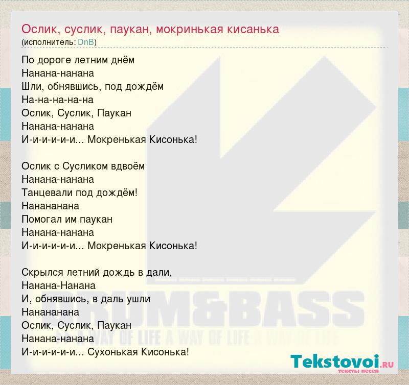 По дороге летним днём Нанана-нанана Шли, обнявшись, под дождём На-на-на-на-на Ослик, Суслик, Паукан Нанана-нанана И-и-и-и-и-и... Мокренькая Кисонька! Ослик с Сусликом вдвоём Нанана-нанана Танцевали под дождём! Нанананана Помогал им паукан Нанана-нанана И-и-и-и-и-и... Мокренькая Кисонька! Скрылся летний дождь в дали, Нанана-Нанана И, обнявшись, в даль ушли Нанананана Ослик, Суслик, Паукан Нанана-нанана И-и-и-и-и-и... Сухонькая Кисонька!