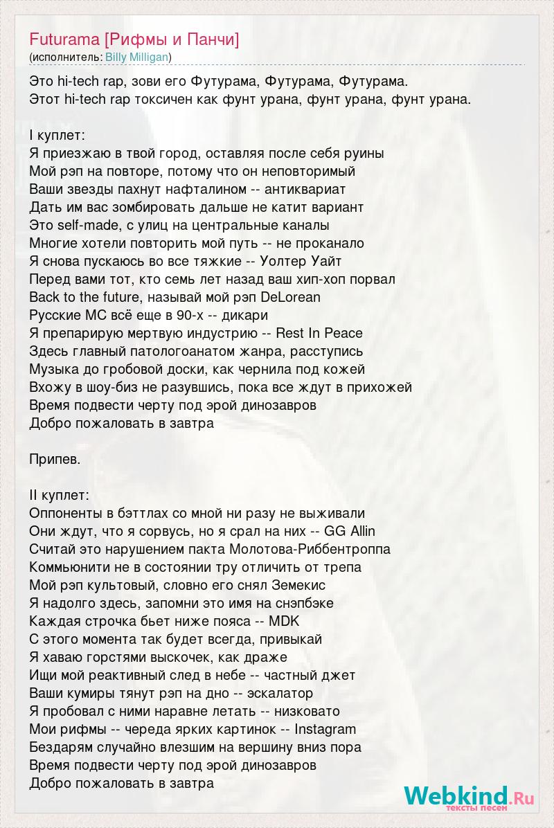 Это hi-tech rap, зови его Футурама, Футурама, Футурама. Этот hi-tech rap токсичен как фунт урана, фунт урана, фунт урана. I куплет: Я приезжаю в твой город, оставляя после себя руины Мой рэп на повторе, потому что он неповторимый Ваши звезды пахнут нафталином -- антиквариат Дать им вас зомбировать дальше не катит вариант Это self-made, с улиц на центральные каналы Многие хотели повторить мой путь -- не проканало Я снова пускаюсь во все тяжкие -- Уолтер Уайт Перед вами тот, кто семь лет назад ваш хип-хоп порвал Back to the future, называй мой рэп DeLorean Русские MC всё еще в 90-х -- дикари Я препарирую мертвую индустрию -- Rest In Peace Здесь главный патологоанатом жанра, расступись Музыка до гробовой доски, как чернила под кожей Вхожу в шоу-биз не разувшись, пока все ждут в прихожей Время подвести черту под эрой динозавров Добро пожаловать в завтра Припев. II куплет: Оппоненты в бэттлах со мной ни разу не выживали Они ждут, что я сорвусь, но я срал на них -- GG Allin Считай это нарушением пакта Молотова-Риббентроппа Коммьюнити не в состоянии тру отличить от трепа Мой рэп культовый, словно его снял Земекис Я надолго здесь, запомни это имя на снэпбэке Каждая строчка бьет ниже пояса -- MDK С этого момента так будет всегда, привыкай Я хаваю горстями выскочек, как драже Ищи мой реактивный след в небе -- частный джет Ваши кумиры тянут рэп на дно -- эскалатор Я пробовал с ними наравне летать -- низковато Мои рифмы -- череда ярких картинок -- Instagram Бездарям случайно влезшим на вершину вниз пора Время подвести черту под эрой динозавров Добро пожаловать в завтра