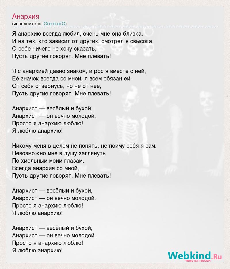 Я анархию всегда любил, очень мне она близка. И на тех, кто зависит от других, смотрел я свысока. О себе ничего не хочу сказать, Пусть другие говорят. Мне плевать! Я с анархией давно знаком, и рос я вместе с ней, Её значок всегда со мной, я всем обязан ей. От себя отвернусь, но не от неё, Пусть другие говорят. Мне плевать! Анархист — весёлый и бухой, Анархист — он вечно молодой. Просто я анархию люблю! Я люблю анархию! Никому меня в целом не понять, не пойму себя я сам. Невозможно мне в душу заглянуть По хмельным моим глазам. Всегда анархия со мной, Пусть другие говорят. Мне плевать! Анархист — весёлый и бухой, Анархист — он вечно молодой. Просто я анархию люблю! Я люблю анархию! Анархист — весёлый и бухой, Анархист — он вечно молодой. Просто я анархию люблю! Я люблю анархию!