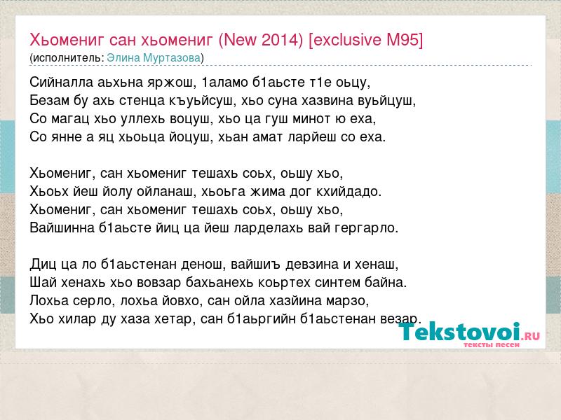 Сийналла аьхьна яржош, 1аламо б1аьсте т1е оьцу, Безам бу ахь стенца къуьйсуш, хьо суна хазвина вуьйцуш, Со магац хьо уллехь воцуш, хьо ца гуш минот ю еха, Со янне а яц хьоьца йоцуш, хьан амат ларйеш со еха. Хьомениг, сан хьомениг тешахь соьх, оьшу хьо, Хьоьх йеш йолу ойланаш, хьоьга жима дог кхийдадо. Хьомениг, сан хьомениг тешахь соьх, оьшу хьо, Вайшинна б1аьсте йиц ца йеш ларделахь вай гергарло. Диц ца ло б1аьстенан денош, вайшиъ девзина и хенаш, Шай хенахь хьо вовзар бахьанехь коьртех синтем байна. Лохьа серло, лохьа йовхо, сан ойла хазйина марзо, Хьо хилар ду хаза хетар, сан б1аьргийн б1аьстенан везар.