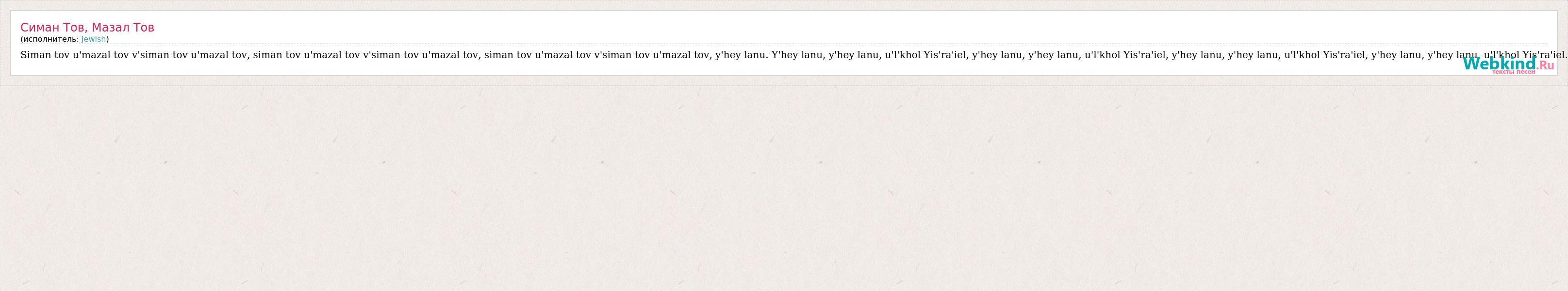 Siman tov u'mazal tov v'siman tov u'mazal tov, siman tov u'mazal tov v'siman tov u'mazal tov, siman tov u'mazal tov v'siman tov u'mazal tov, y'hey lanu. Y'hey lanu, y'hey lanu, u'l'khol Yis'ra'iel, y'hey lanu, y'hey lanu, u'l'khol Yis'ra'iel, y'hey lanu, y'hey lanu, u'l'khol Yis'ra'iel, y'hey lanu, y'hey lanu, u'l'khol Yis'ra'iel.