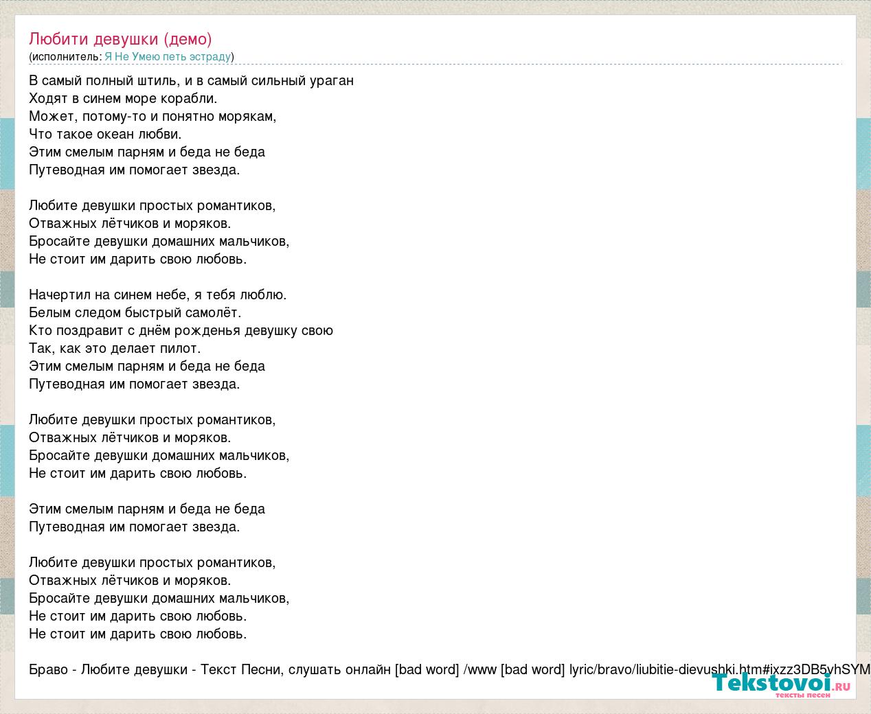 В самый полный штиль, и в самый сильный ураган Ходят в синем море корабли. Может, потому-то и понятно морякам, Что такое океан любви. Этим смелым парням и беда не беда Путеводная им помогает звезда. Любите девушки простых романтиков, Отважных лётчиков и моряков. Бросайте девушки домашних мальчиков, Не стоит им дарить свою любовь. Начертил на синем небе, я тебя люблю. Белым следом быстрый самолёт. Кто поздравит с днём рожденья девушку свою Так, как это делает пилот. Этим смелым парням и беда не беда Путеводная им помогает звезда. Любите девушки простых романтиков, Отважных лётчиков и моряков. Бросайте девушки домашних мальчиков, Не стоит им дарить свою любовь. Этим смелым парням и беда не беда Путеводная им помогает звезда. Любите девушки простых романтиков, Отважных лётчиков и моряков. Бросайте девушки домашних мальчиков, Не стоит им дарить свою любовь. Не стоит им дарить свою любовь. Браво - Любите девушки - Текст Песни, слушать онлайн [bad word] /www [bad word] lyric/bravo/liubitie-dievushki.htm#ixzz3DB5vhSYM