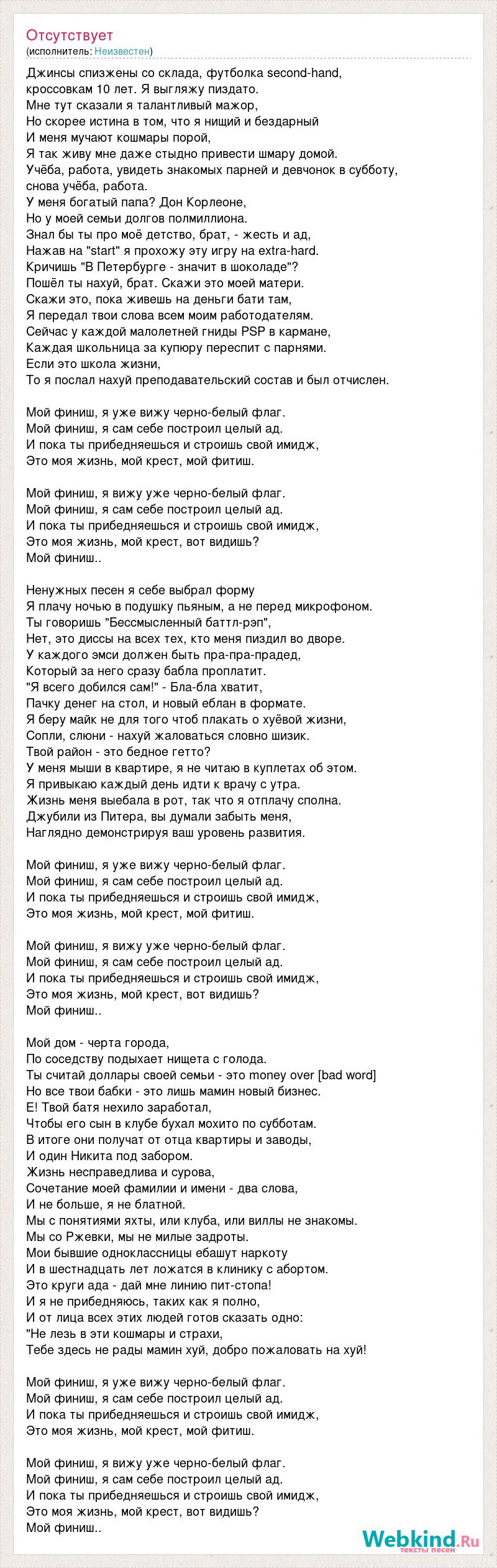 Джинсы спизжены со склада, футболка second-hand, кроссовкам 10 лет. Я выгляжу пиздато. Мне тут сказали я талантливый мажор, Но скорее истина в том, что я нищий и бездарный И меня мучают кошмары порой, Я так живу мне даже стыдно привести шмару домой. Учёба, работа, увидеть знакомых парней и девчонок в субботу, снова учёба, работа. У меня богатый папа? Дон Корлеоне, Но у моей семьи долгов полмиллиона. Знал бы ты про моё детство, брат, - жесть и ад, Нажав на "start" я прохожу эту игру на extra-hard. Кричишь "В Петербурге - значит в шоколаде"? Пошёл ты нахуй, брат. Скажи это моей матери. Скажи это, пока живешь на деньги бати там, Я передал твои слова всем моим работодателям. Сейчас у каждой малолетней гниды PSP в кармане, Каждая школьница за купюру переспит с парнями. Если это школа жизни, То я послал нахуй преподавательский состав и был отчислен. Мой финиш, я уже вижу черно-белый флаг. Мой финиш, я сам себе построил целый ад. И пока ты прибедняешься и строишь свой имидж, Это моя жизнь, мой крест, мой фитиш. Мой финиш, я вижу уже черно-белый флаг. Мой финиш, я сам себе построил целый ад. И пока ты прибедняешься и строишь свой имидж, Это моя жизнь, мой крест, вот видишь? Мой финиш.. Ненужных песен я себе выбрал форму Я плачу ночью в подушку пьяным, а не перед микрофоном. Ты говоришь "Бессмысленный баттл-рэп", Нет, это диссы на всех тех, кто меня пиздил во дворе. У каждого эмси должен быть пра-пра-прадед, Который за него сразу бабла проплатит. "Я всего добился сам!" - Бла-бла хватит, Пачку денег на стол, и новый еблан в формате. Я беру майк не для того чтоб плакать о хуёвой жизни, Сопли, слюни - нахуй жаловаться словно шизик. Твой район - это бедное гетто? У меня мыши в квартире, я не читаю в куплетах об этом. Я привыкаю каждый день идти к врачу с утра. Жизнь меня выебала в рот, так что я отплачу сполна. Джубили из Питера, вы думали забыть меня, Наглядно демонстрируя ваш уровень развития. Мой финиш, я уже вижу черно-белый флаг. Мой финиш, я сам себе построил целый ад. И пока ты прибедняешься и строишь свой имидж, Это моя жизнь, мой крест, мой фитиш. Мой финиш, я вижу уже черно-белый флаг. Мой финиш, я сам себе построил целый ад. И пока ты прибедняешься и строишь свой имидж, Это моя жизнь, мой крест, вот видишь? Мой финиш.. Мой дом - черта города, По соседству подыхает нищета с голода. Ты считай доллары своей семьи - это money over [bad word] Но все твои бабки - это лишь мамин новый бизнес. Е! Твой батя нехило заработал, Чтобы его сын в клубе бухал мохито по субботам. В итоге они получат от отца квартиры и заводы, И один Никита под забором. Жизнь несправедлива и сурова, Сочетание моей фамилии и имени - два слова, И не больше, я не блатной. Мы с понятиями яхты, или клуба, или виллы не знакомы. Мы со Ржевки, мы не милые задроты. Мои бывшие одноклассницы ебашут наркоту И в шестнадцать лет ложатся в клинику с абортом. Это круги ада - дай мне линию пит-стопа! И я не прибедняюсь, таких как я полно, И от лица всех этих людей готов сказать одно: "Не лезь в эти кошмары и страхи, Тебе здесь не рады мамин хуй, добро пожаловать на хуй! Мой финиш, я уже вижу черно-белый флаг. Мой финиш, я сам себе построил целый ад. И пока ты прибедняешься и строишь свой имидж, Это моя жизнь, мой крест, мой фитиш. Мой финиш, я вижу уже черно-белый флаг. Мой финиш, я сам себе построил целый ад. И пока ты прибедняешься и строишь свой имидж, Это моя жизнь, мой крест, вот видишь? Мой фи