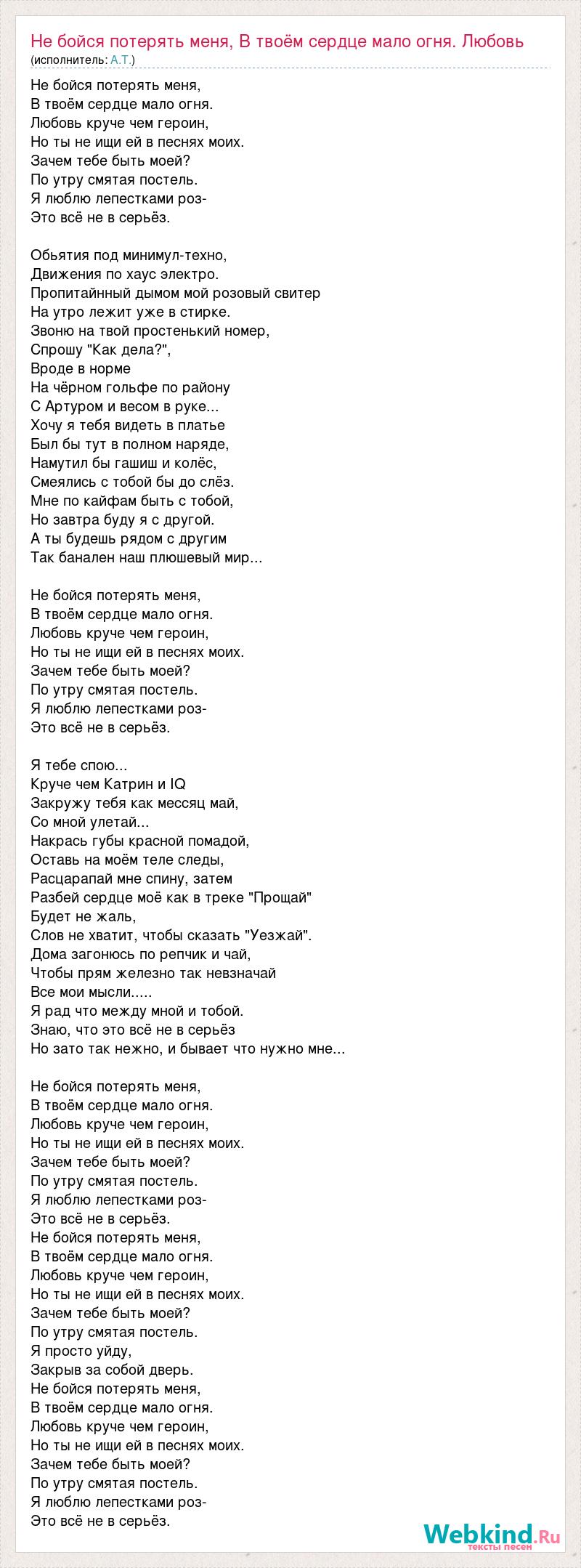 Главная→Исполнители→А.Т.→Не бойся потерять меня, В твоём сердце мало огня. Любовь круче чем героин, Но