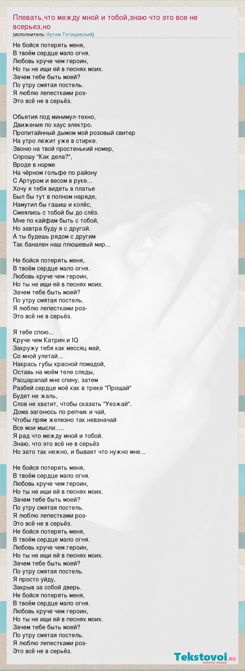 Не бойся потерять меня, В твоём сердце мало огня. Любовь круче чем героин, Но ты не ищи ей в песнях моих. Зачем тебе быть моей? По утру смятая постель. Я люблю лепестками роз- Это всё не в серьёз. Обьятия под минимул-техно, Движения по хаус электро. Пропитайнный дымом мой розовый свитер На утро лежит уже в стирке. Звоню на твой простенький номер, Спрошу "Как дела?", Вроде в норме На чёрном гольфе по району С Артуром и весом в руке... Хочу я тебя видеть в платье Был бы тут в полном наряде, Намутил бы гашиш и колёс, Смеялись с тобой бы до слёз. Мне по кайфам быть с тобой, Но завтра буду я с другой. А ты будешь рядом с другим Так банален наш плюшевый мир... Не бойся потерять меня, В твоём сердце мало огня. Любовь круче чем героин, Но ты не ищи ей в песнях моих. Зачем тебе быть моей? По утру смятая постель. Я люблю лепестками роз- Это всё не в серьёз. Я тебе спою... Круче чем Катрин и IQ Закружу тебя как мессяц май, Со мной улетай... Накрась губы красной помадой, Оставь на моём теле следы, Расцарапай мне спину, затем Разбей сердце моё как в треке "Прощай" Будет не жаль, Слов не хватит, чтобы сказать "Уезжай". Дома загонюсь по репчик и чай, Чтобы прям железно так невзначай Все мои мысли..... Я рад что между мной и тобой. Знаю, что это всё не в серьёз Но зато так нежно, и бывает что нужно мне... Не бойся потерять меня, В твоём сердце мало огня. Любовь круче чем героин, Но ты не ищи ей в песнях моих. Зачем тебе быть моей? По утру смятая постель. Я люблю лепестками роз- Это всё не в серьёз. Не бойся потерять меня, В твоём сердце мало огня. Любовь круче чем героин, Но ты не ищи ей в песнях моих. Зачем тебе быть моей? По утру смятая постель. Я просто уйду, Закрыв за собой дверь. Не бойся потерять меня, В твоём сердце мало огня. Любовь круче чем героин, Но ты не ищи ей в песнях моих. Зачем тебе быть моей? По утру смятая постель. Я люблю лепестками роз- Это всё не в серьёз.