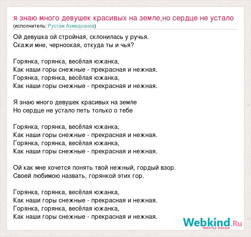 Ой девушка ой стройная, склонилась у ручья. Скажи мне, черноокая, откуда ты и чья? Горянка, горянка, весёлая южанка, Как наши горы снежные - прекрасная и нежная. Горянка, горянка, весёлая южанка, Как наши горы снежные - прекрасная и нежная. Я знаю много девушек красивых на земле Но сердце не устало петь только о тебе Горянка, горянка, весёлая южанка, Как наши горы снежные - прекрасная и нежная. Горянка, горянка, весёлая южанка, Как наши горы снежные - прекрасная и нежная. Ой как мне хочется понять твой нежный, гордый взор. Своей любимою назвать, горянкой этих гор. Горянка, горянка, весёлая южанка, Как наши горы снежные - прекрасная и нежная. Горянка, горянка, весёлая южанка, Как наши горы снежные - прекрасная и нежная.