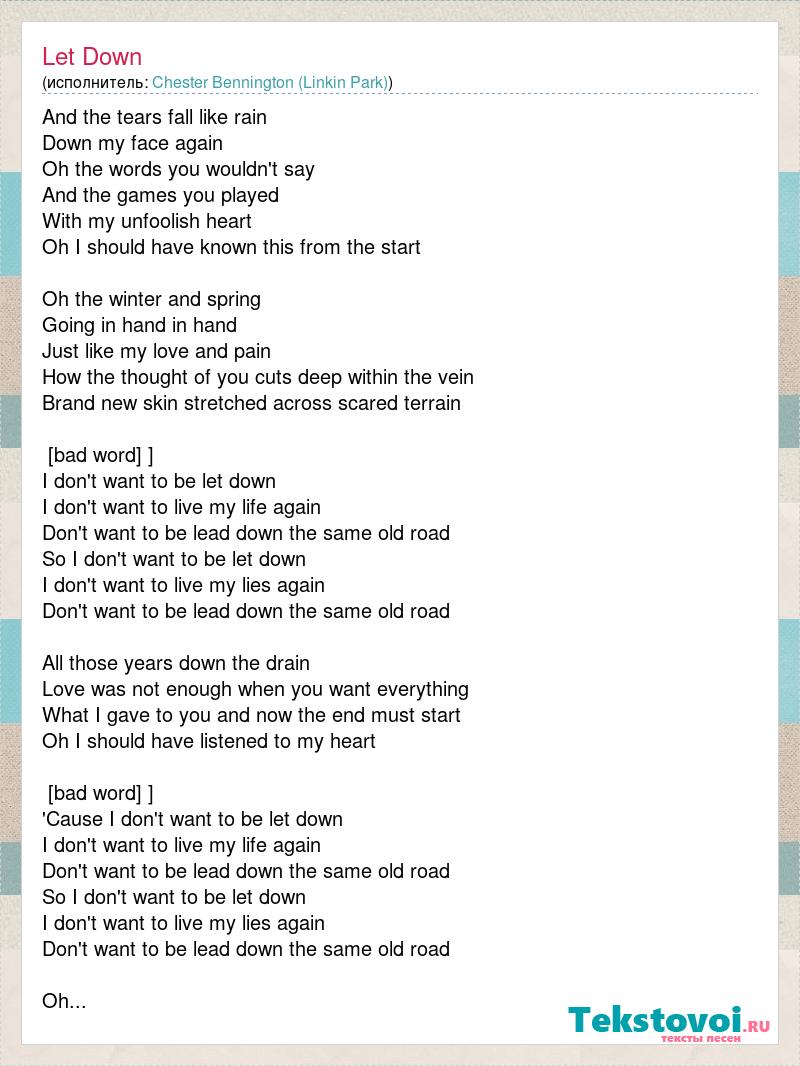 And the tears fall like rain Down my face again Oh the words you wouldn't say And the games you played With my unfoolish heart Oh I should have known this from the start Oh the winter and spring Going in hand in hand Just like my love and pain How the thought of you cuts deep within the vein Brand new skin stretched across scared terrain [bad word] ] I don't want to be let down I don't want to live my life again Don't want to be lead down the same old road So I don't want to be let down I don't want to live my lies again Don't want to be lead down the same old road All those years down the drain Love was not enough when you want everything What I gave to you and now the end must start Oh I should have listened to my heart [bad word] ] 'Cause I don't want to be let down I don't want to live my life again Don't want to be lead down the same old road So I don't want to be let down I don't want to live my lies again Don't want to be lead down the same old road Oh...