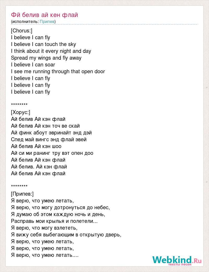 [Chorus:] I believe I can fly I believe I can touch the sky I think about it every night and day Spread my wings and fly away I believe I can soar I see me running through that open door I believe I can fly I believe I can fly I believe I can fly ******** [Хорус:] Ай белив Ай кэн флай Ай белив Ай кэн точ ве скай Ай финк абоут эвринайт энд дэй Спед май вингс энд флай эвей Ай белив Ай кэн шоо Ай си ми ранинг тру вэт опен доо Ай белив Ай кэн флай Ай белив. Ай кэн флай Ай белив Ай кэн флай ******** [Припев:] Я верю, что умею летать, Я верю, что могу дотронуться до небес, Я думаю об этом каждую ночь и день, Расправь мои крылья и полетели... Я верю, что могу взлететь, Я вижу себя выбегающим в открытую дверь, Я верю, что умею летать, Я верю, что умею летать, Я верю, что умею летать....