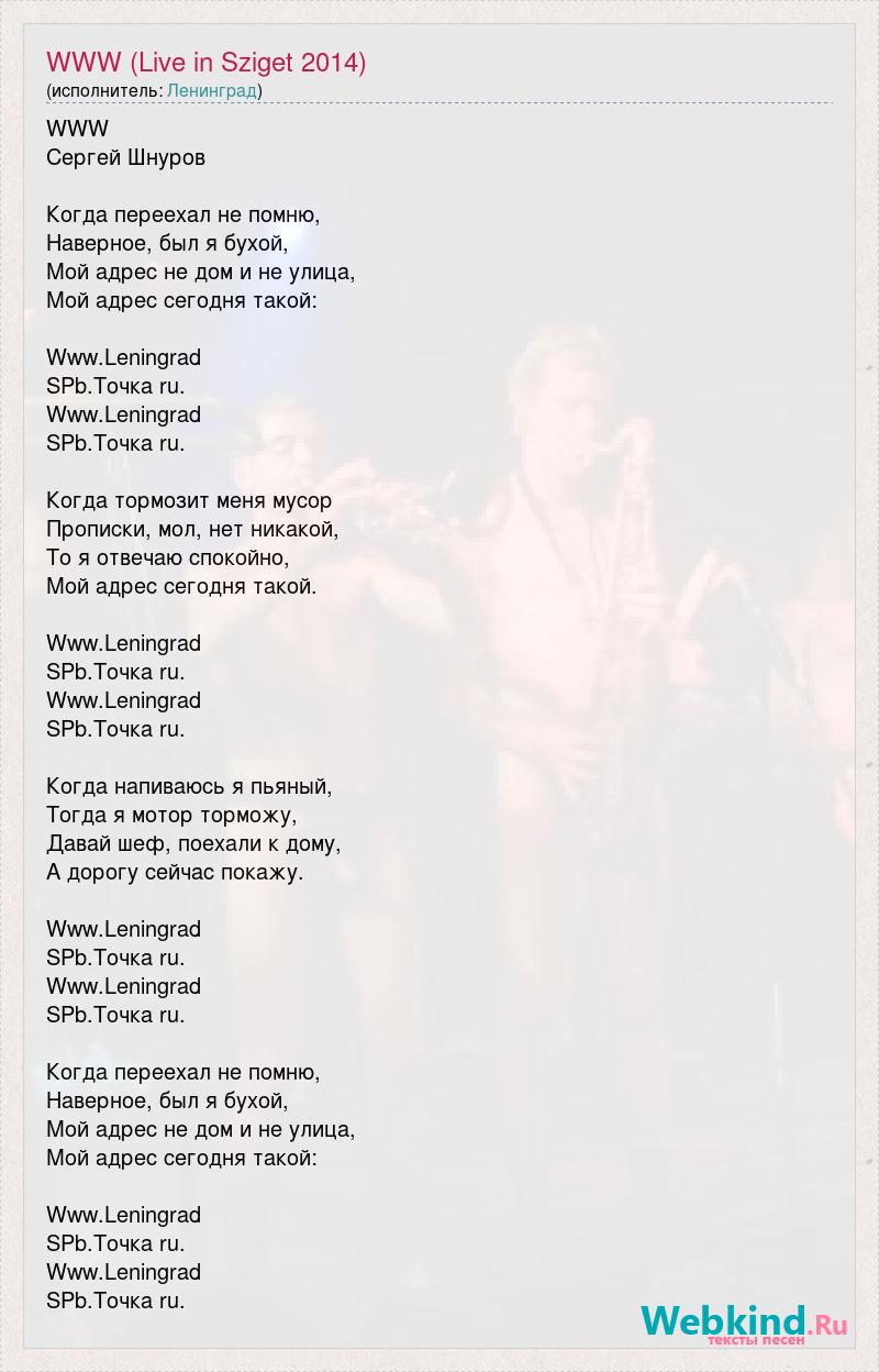 WWW Сергей Шнуров Когда переехал не помню, Наверное, был я бухой, Мой адрес не дом и не улица, Мой адрес сегодня такой: Www.Leningrad SPb.Точка ru. Www.Leningrad SPb.Точка ru. Когда тормозит меня мусор Прописки, мол, нет никакой, То я отвечаю спокойно, Мой адрес сегодня такой. Www.Leningrad SPb.Точка ru. Www.Leningrad SPb.Точка ru. Когда напиваюсь я пьяный, Тогда я мотор торможу, Давай шеф, поехали к дому, А дорогу сейчас покажу. Www.Leningrad SPb.Точка ru. Www.Leningrad SPb.Точка ru. Когда переехал не помню, Наверное, был я бухой, Мой адрес не дом и не улица, Мой адрес сегодня такой: Www.Leningrad SPb.Точка ru. Www.Leningrad SPb.Точка ru.