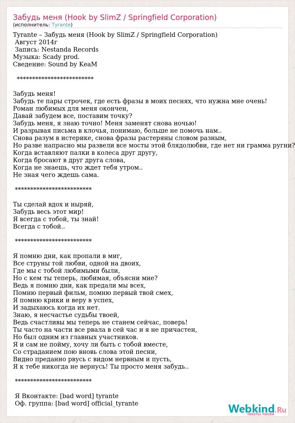 Tyrante – Забудь меня (Hook by SlimZ / Springfield Corporation) Август 2014г Запись: Nestanda Records Музыка: Scady prod. Сведение: Sound by KeaM ************************* Забудь меня! Забудь те пары строчек, где есть фразы в моих песнях, что нужна мне очень! Роман любимых для меня окончен, Давай забудем все, поставим точку? Забудь меня, я знаю точно! Меня заменят снова ночью! И разрывая письма в клочья, понимаю, больше не помочь нам.. Снова разум в истерике, снова фразы растеряны словом разным, Но разве напрасно мы развели все мосты этой блядолюбви, где нет ни грамма ругни? Когда вставляют палки в колеса друг другу, Когда бросают в друг друга слова, Когда не знаешь, что ждет тебя утром.. Не зная чего ждешь сама. ************************* Ты сделай вдох и ныряй, Забудь весь этот мир! Я всегда с тобой, ты знай! Всегда с тобой.. ************************* Я помню дни, как пропали в миг, Все струны той любви, одной на двоих, Где мы с тобой любимыми были, Но с кем ты теперь, любимая, объясни мне? Ведь я помню дни, как предали мы всех, Помню первый фильм, помню первый твой смех, Я помню крики и веру в успех, И задыхаюсь когда их нет. Знаю, я несчастье судьбы твоей, Ведь счастливы мы теперь не станем сейчас, поверь! Ты часто на части все рвала в сей час и я не причастен, Но был одним из главных участников. Я и сам не пойму, хочу ли быть с тобой вместе, Со страданием пою вновь слова этой песни, Видно преданно рвусь с видом нервным и пусть, Я к тебе никогда не вернусь! Ты просто меня забудь.. ************************* Я Вконтакте: [bad word] tyrante Оф. группа: [bad word] official_tyrante