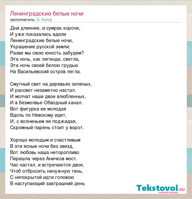Дни длиннее, и сумрак короче, И уже показались вдали Ленинградские белые ночи, Украшение русской земли. Разве мы свою юность забудем? Эта ночь, как легенда, светла, Эта ночь своей белою грудью На Васильевский остров легла. Смутный свет на деревьях зеленых, И рассвет незаметно настал. И молчат наши двое влюбленных, И в безмолвье Обводный канал. Вот фигурка ее молодая Вдоль по Невскому идет, И, с волненьем ее поджидая, Скромный парень стоит у ворот. Хорошо молодым и счастливым В эти ясные ночи без звезд, Вот любовь наша неторопливо Перешла через Аничков мост. Час настал, и встречаются двое, Чтоб отбросить ненужную тень, С непокрытой идти головою В наступающий завтрашний день