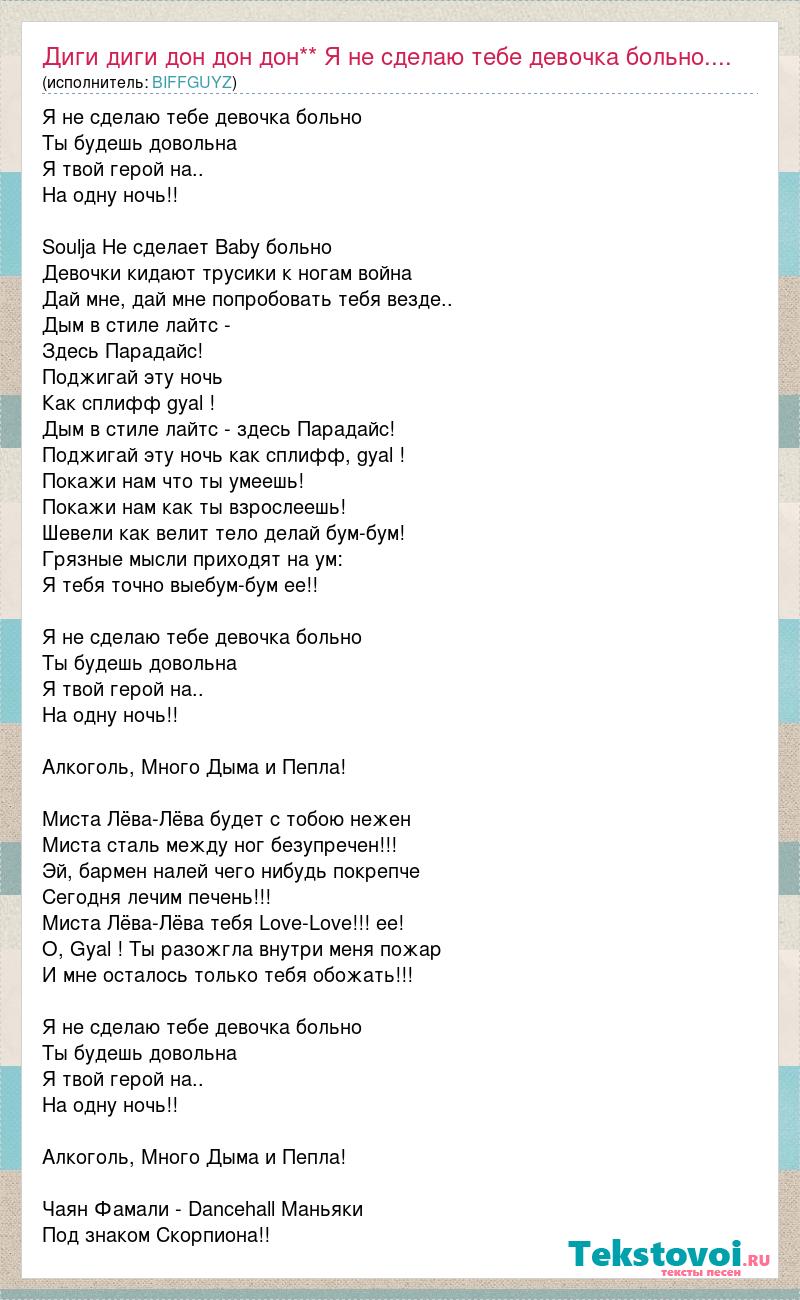 Я не сделаю тебе девочка больно Ты будешь довольна Я твой герой на.. На одну ночь!! Soulja Не сделает Baby больно Девочки кидают трусики к ногам война Дай мне, дай мне попробовать тебя везде.. Дым в стиле лайтс - Здесь Парадайс! Поджигай эту ночь Как сплифф gyal ! Дым в стиле лайтс - здесь Парадайс! Поджигай эту ночь как сплифф, gyal ! Покажи нам что ты умеешь! Покажи нам как ты взрослеешь! Шевели как велит тело делай бум-бум! Грязные мысли приходят на ум: Я тебя точно выебум-бум ее!! Я не сделаю тебе девочка больно Ты будешь довольна Я твой герой на.. На одну ночь!! Алкоголь, Много Дыма и Пепла! Миста Лёва-Лёва будет с тобою нежен Миста сталь между ног безупречен!!! Эй, бармен налей чего нибудь покрепче Сегодня лечим печень!!! Миста Лёва-Лёва тебя Love-Love!!! ее! O, Gyal ! Ты разожгла внутри меня пожар И мне осталось только тебя обожать!!! Я не сделаю тебе девочка больно Ты будешь довольна Я твой герой на.. На одну ночь!! Алкоголь, Много Дыма и Пепла! Чаян Фамали - Dancehall Маньяки Под знаком Скорпиона!!