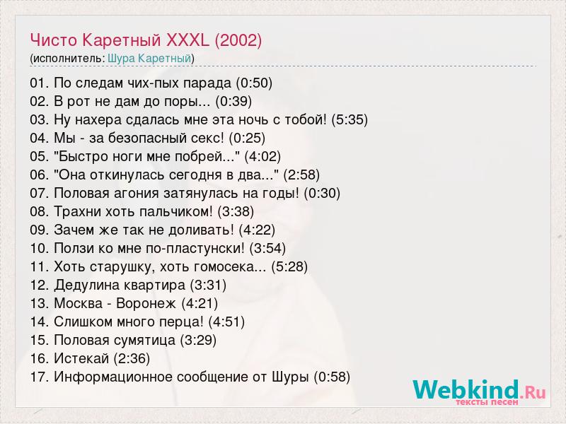 01. По следам чих-пых парада (0:50) 02. В рот не дам до поры... (0:39) 03. Ну нахера сдалась мне эта ночь с тобой! (5:35) 04. Мы - за безопасный секс! (0:25) 05. "Быстро ноги мне побрей..." (4:02) 06. "Она откинулась сегодня в два..." (2:58) 07. Половая агония затянулась на годы! (0:30) 08. Трахни хоть пальчиком! (3:38) 09. Зачем же так не доливать! (4:22) 10. Ползи ко мне по-пластунски! (3:54) 11. Хоть старушку, хоть гомосека... (5:28) 12. Дедулина квартира (3:31) 13. Москва - Воронеж (4:21) 14. Слишком много перца! (4:51) 15. Половая сумятица (3:29) 16. Истекай (2:36) 17. Информационное сообщение от Шуры (0:58)