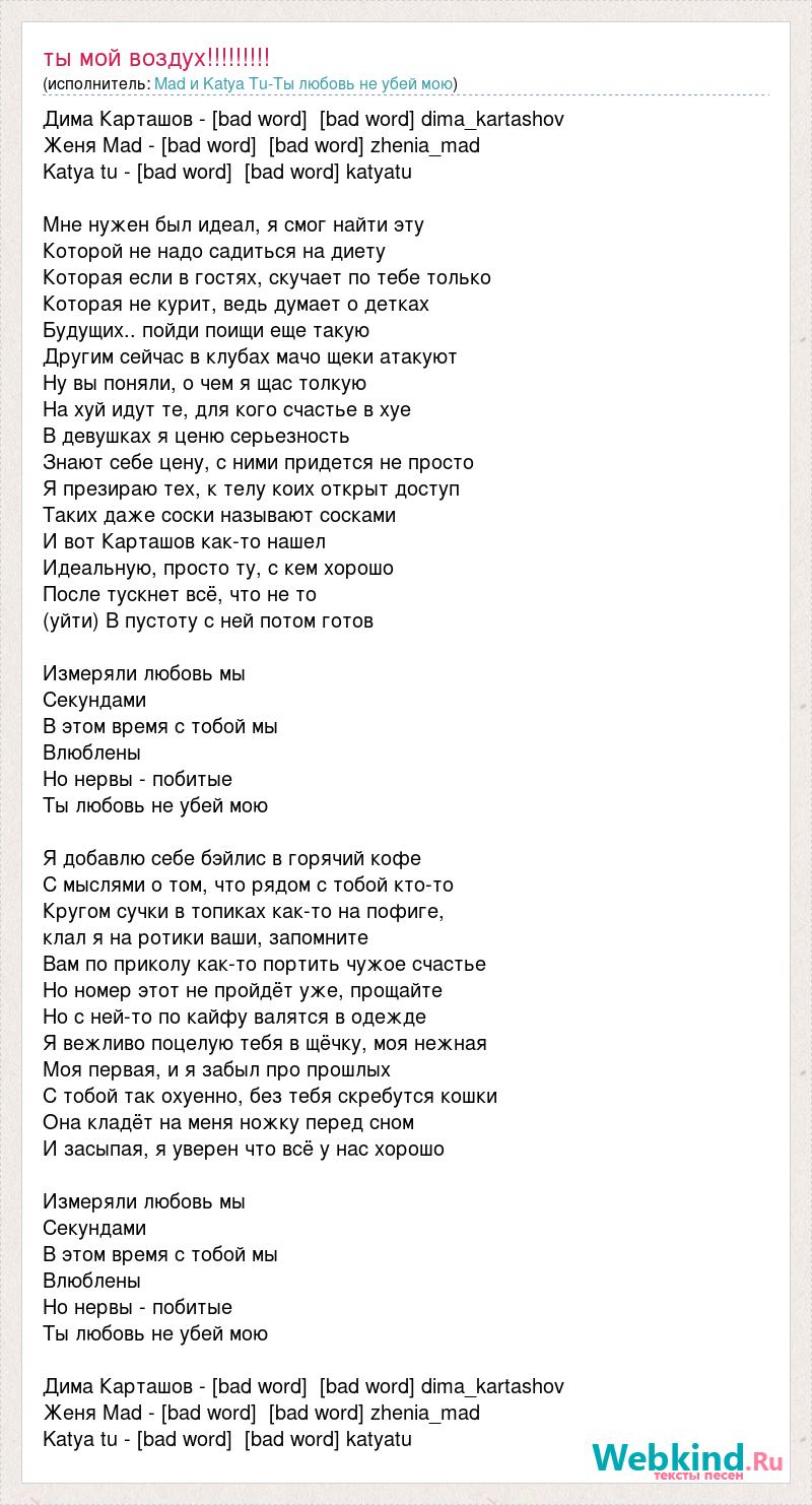 Дима Карташов - [bad word] [bad word] dima_kartashov Женя Mad - [bad word] [bad word] zhenia_mad Katya tu - [bad word] [bad word] katyatu Мне нужен был идеал, я смог найти эту Которой не надо садиться на диету Которая если в гостях, скучает по тебе только Которая не курит, ведь думает о детках Будущих.. пойди поищи еще такую Другим сейчас в клубах мачо щеки атакуют Ну вы поняли, о чем я щас толкую На хуй идут те, для кого счастье в хуе В девушках я ценю серьезность Знают себе цену, с ними придется не просто Я презираю тех, к телу коих открыт доступ Таких даже соски называют сосками И вот Карташов как-то нашел Идеальную, просто ту, с кем хорошо После тускнет всё, что не то (уйти) В пустоту с ней потом готов Измеряли любовь мы Секундами В этом время с тобой мы Влюблены Но нервы - побитые Ты любовь не убей мою Я добавлю себе бэйлис в горячий кофе С мыслями о том, что рядом с тобой кто-то Кругом сучки в топиках как-то на пофиге, клал я на ротики ваши, запомните Вам по приколу как-то портить чужое счастье Но номер этот не пройдёт уже, прощайте Но с ней-то по кайфу валятся в одежде Я вежливо поцелую тебя в щёчку, моя нежная Моя первая, и я забыл про прошлых С тобой так охуенно, без тебя скребутся кошки Она кладёт на меня ножку перед сном И засыпая, я уверен что всё у нас хорошо Измеряли любовь мы Секундами В этом время с тобой мы Влюблены Но нервы - побитые Ты любовь не убей мою Дима Карташов - [bad word] [bad word] dima_kartashov Женя Mad - [bad word] [bad word] zhenia_mad Katya tu - [bad word] [bad word] katyatu
