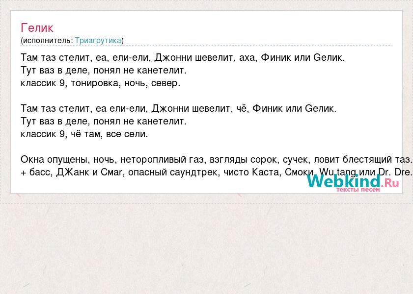Там таз стелит, еа, ели-ели, Джонни шевелит, аха, Финик или Gелик. Тут ваз в деле, понял не канетелит. классик 9, тонировка, ночь, север. Там таз стелит, еа ели-ели, Джонни шевелит, чё, Финик или Gелик. Тут ваз в деле, понял не канетелит. классик 9, чё там, все сели. Окна опущены, ночь, неторопливый газ, взгляды сорок, сучек, ловит блестящий таз. + басс, ДЖанк и Смаr, опасный саундтрек, чисто Каста, Смоки, Wu tang или Dr. Dre.