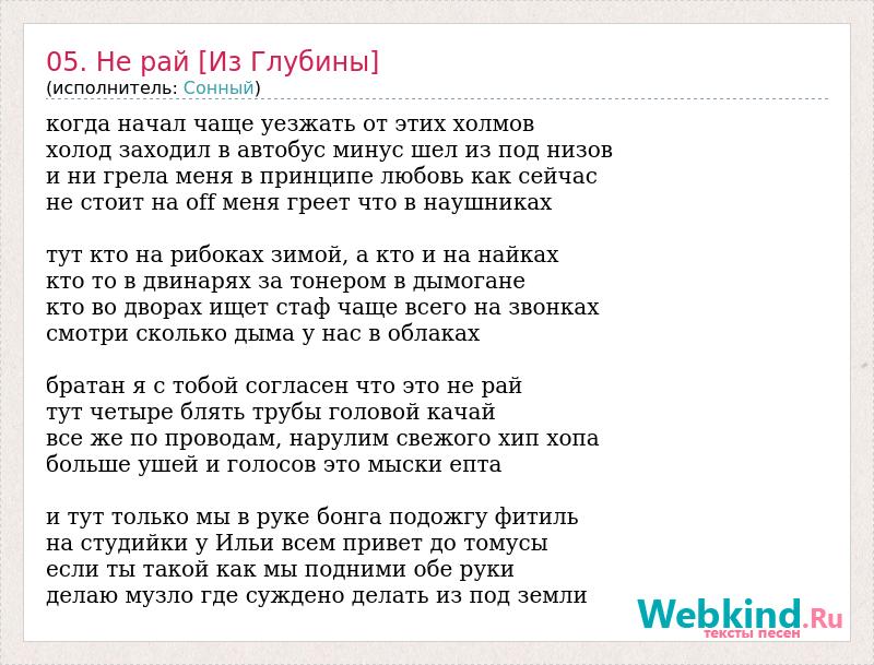 когда начал чаще уезжать от этих холмов холод заходил в автобус минус шел из под низов и ни грела меня в принципе любовь как сейчас не стоит на оff меня греет что в наушниках тут кто на рибоках зимой, а кто и на найках кто то в двинарях за тонером в дымогане кто во дворах ищет стаф чаще всего на звонках смотри сколько дыма у нас в облаках братан я c тобой согласен что это не рай тут четыре блять трубы головой качай все же по проводам, нарулим свежого хип хопа больше ушей и голосов это мыски епта и тут только мы в руке бонга подожгу фитиль на студийки у Ильи всем привет до томусы если ты такой как мы подними обе руки делаю музло где суждено делать из под земли