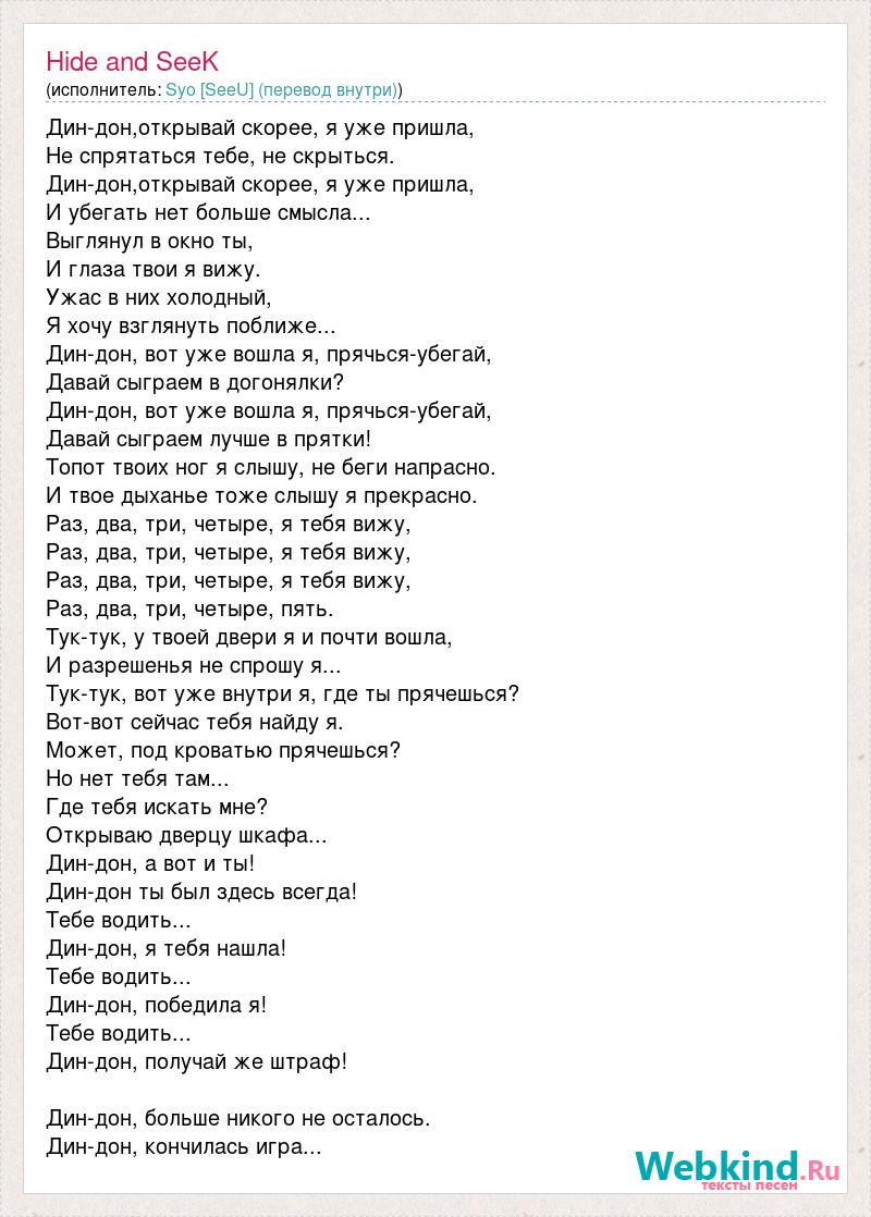 Дин-дон,открывай скорее, я уже пришла, Не спрятаться тебе, не скрыться. Дин-дон,открывай скорее, я уже пришла, И убегать нет больше смысла... Выглянул в окно ты, И глаза твои я вижу. Ужас в них холодный, Я хочу взглянуть поближе... Дин-дон, вот уже вошла я, прячься-убегай, Давай сыграем в догонялки? Дин-дон, вот уже вошла я, прячься-убегай, Давай сыграем лучше в прятки! Топот твоих ног я слышу, не беги напрасно. И твое дыханье тоже слышу я прекрасно. Раз, два, три, четыре, я тебя вижу, Раз, два, три, четыре, я тебя вижу, Раз, два, три, четыре, я тебя вижу, Раз, два, три, четыре, пять. Тук-тук, у твоей двери я и почти вошла, И разрешенья не спрошу я... Тук-тук, вот уже внутри я, где ты прячешься? Вот-вот сейчас тебя найду я. Может, под кроватью прячешься? Но нет тебя там... Где тебя искать мне? Открываю дверцу шкафа... Дин-дон, а вот и ты! Дин-дон ты был здесь всегда! Тебе водить... Дин-дон, я тебя нашла! Тебе водить... Дин-дон, победила я! Тебе водить... Дин-дон, получай же штраф! Дин-дон, больше никого не осталось. Дин-дон, кончилась игра...