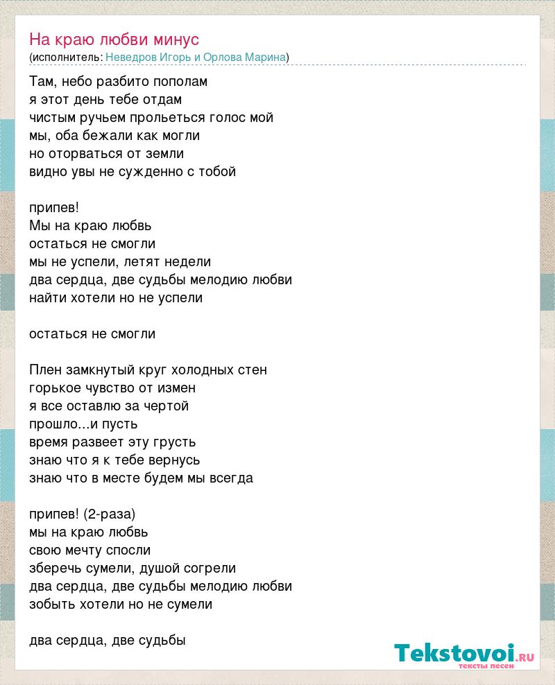 Там, небо разбито пополам я этот день тебе отдам чистым ручьем прольеться голос мой мы, оба бежали как могли но оторваться от земли видно увы не сужденно с тобой припев! Мы на краю любвь остаться не смогли мы не успели, летят недели два сердца, две судьбы мелодию любви найти хотели но не успели остаться не смогли Плен замкнутый круг холодных стен горькое чувство от измен я все оставлю за чертой прошло...и пусть время развеет эту грусть знаю что я к тебе вернусь знаю что в месте будем мы всегда припев! (2-раза) мы на краю любвь свою мечту спосли зберечь сумели, душой согрели два сердца, две судьбы мелодию любви зобыть хотели но не сумели два сердца, две судьбы