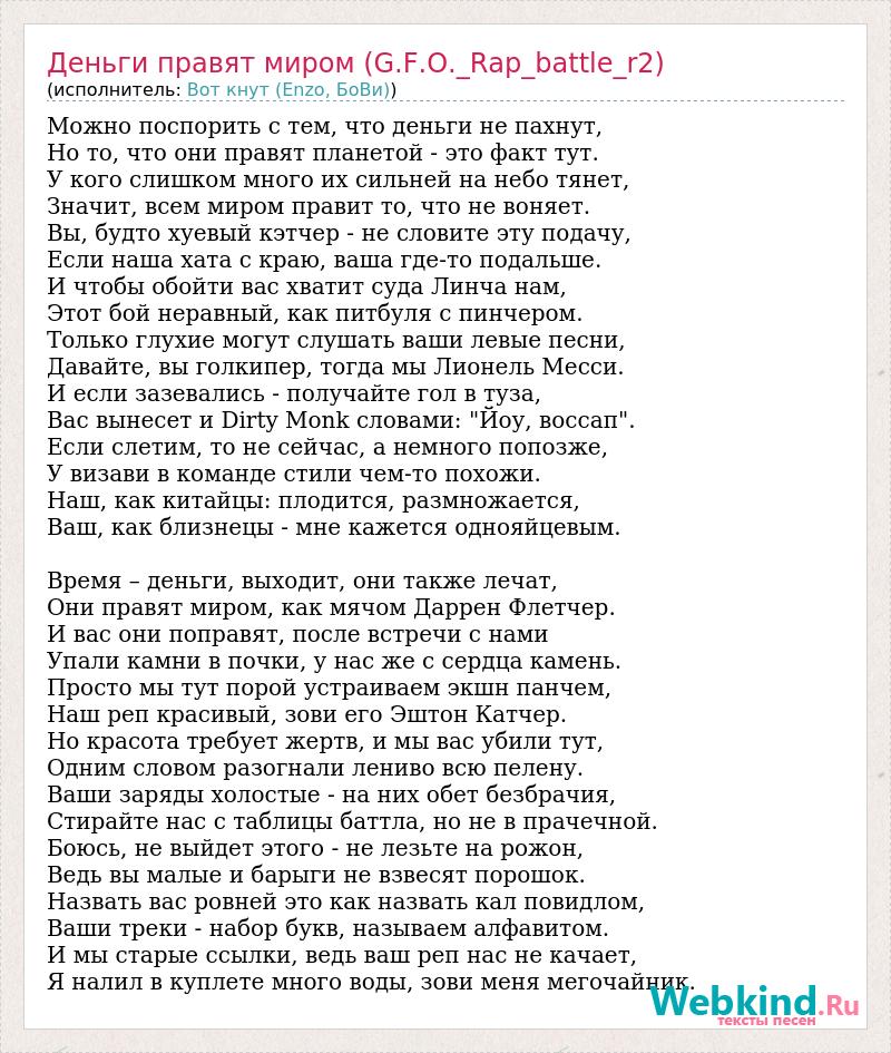 Можно поспорить с тем, что деньги не пахнут, Но то, что они правят планетой - это факт тут. У кого слишком много их сильней на небо тянет, Значит, всем миром правит то, что не воняет. Вы, будто хуевый кэтчер - не словите эту подачу, Если наша хата с краю, ваша где-то подальше. И чтобы обойти вас хватит суда Линча нам, Этот бой неравный, как питбуля с пинчером. Только глухие могут слушать ваши левые песни, Давайте, вы голкипер, тогда мы Лионель Месси. И если зазевались - получайте гол в туза, Вас вынесет и Dirty Monk словами: "Йоу, воссап". Если слетим, то не сейчас, а немного попозже, У визави в команде стили чем-то похожи. Наш, как китайцы: плодится, размножается, Ваш, как близнецы - мне кажется однояйцевым. Время – деньги, выходит, они также лечат, Они правят миром, как мячом Даррен Флетчер. И вас они поправят, после встречи с нами Упали камни в почки, у нас же с сердца камень. Просто мы тут порой устраиваем экшн панчем, Наш реп красивый, зови его Эштон Катчер. Но красота требует жертв, и мы вас убили тут, Одним словом разогнали лениво всю пелену. Ваши заряды холостые - на них обет безбрачия, Стирайте нас с таблицы баттла, но не в прачечной. Боюсь, не выйдет этого - не лезьте на рожон, Ведь вы малые и барыги не взвесят порошок. Назвать вас ровней это как назвать кал повидлом, Ваши треки - набор букв, называем алфавитом. И мы старые ссылки, ведь ваш реп нас не качает, Я налил в куплете много воды, зови меня мегочайник.