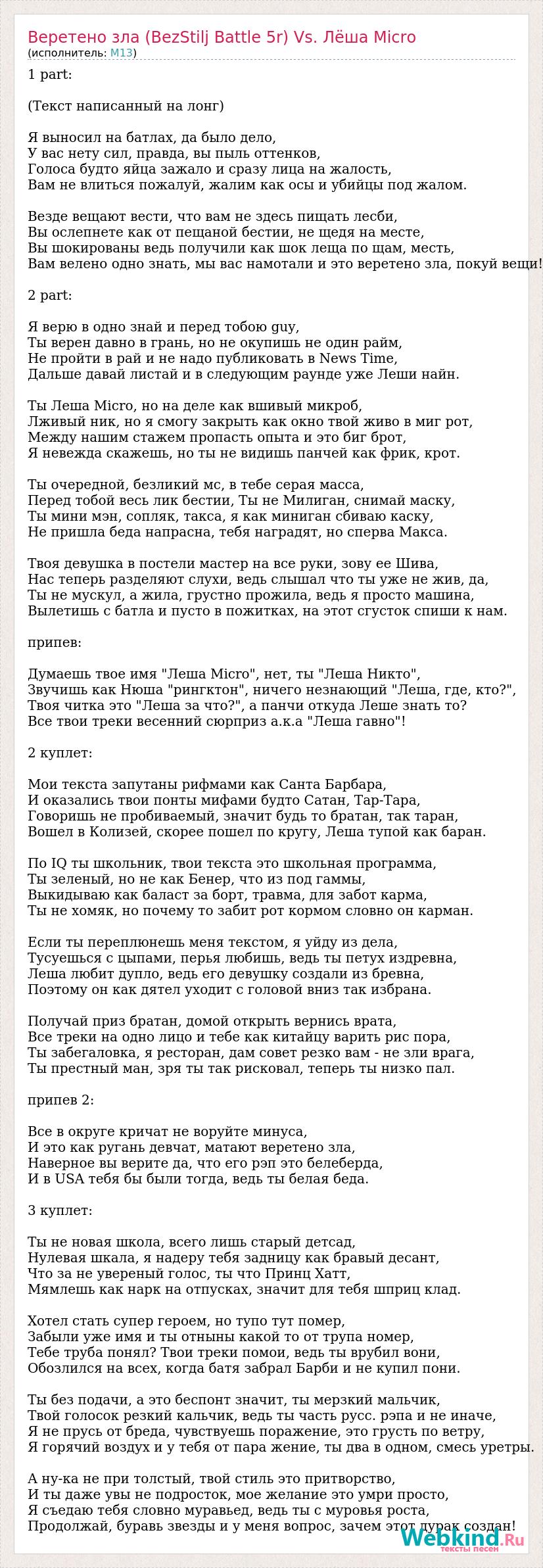 1 part: (Текст написанный на лонг) Я выносил на батлах, да было дело, У вас нету сил, правда, вы пыль оттенков, Голоса будто яйца зажало и сразу лица на жалость, Вам не влиться пожалуй, жалим как осы и убийцы под жалом. Везде вещают вести, что вам не здесь пищать лесби, Вы ослепнете как от пещаной бестии, не щедя на месте, Вы шокированы ведь получили как шок леща по щам, месть, Вам велено одно знать, мы вас намотали и это веретено зла, покуй вещи! 2 part: Я верю в одно знай и перед тобою guy, Ты верен давно в грань, но не окупишь не один райм, Не пройти в рай и не надо публиковать в News Time, Дальше давай листай и в следующим раунде уже Леши найн. Ты Леша Micro, но на деле как вшивый микроб, Лживый ник, но я смогу закрыть как окно твой живо в миг рот, Между нашим стажем пропасть опыта и это биг брот, Я невежда скажешь, но ты не видишь панчей как фрик, крот. Ты очередной, безликий мс, в тебе серая масса, Перед тобой весь лик бестии, Ты не Милиган, снимай маску, Ты мини мэн, сопляк, такса, я как миниган сбиваю каску, Не пришла беда напрасна, тебя наградят, но сперва Макса. Твоя девушка в постели мастер на все руки, зову ее Шива, Нас теперь разделяют слухи, ведь слышал что ты уже не жив, да, Ты не мускул, а жила, грустно прожила, ведь я просто машина, Вылетишь с батла и пусто в пожитках, на этот сгусток спиши к нам. припев: Думаешь твое имя "Леша Micro", нет, ты "Леша Никто", Звучишь как Нюша "рингктон", ничего незнающий "Леша, где, кто?", Твоя читка это "Леша за что?", а панчи откуда Леше знать то? Все твои треки весенний сюрприз а.к.а "Леша гавно"! 2 куплет: Мои текста запутаны рифмами как Санта Барбара, И оказались твои понты мифами будто Сатан, Тар-Тара, Говоришь не пробиваемый, значит будь то братан, так таран, Вошел в Колизей, скорее пошел по кругу, Леша тупой как баран. По IQ ты школьник, твои текста это школьная программа, Ты зеленый, но не как Бенер, что из под гаммы, Выкидываю как баласт за борт, травма, для забот карма, Ты не хомяк, но почему то забит рот кормом словно он карман. Если ты переплюнешь меня текстом, я уйду из дела, Тусуешься с цыпами, перья любишь, ведь ты петух издревна, Леша любит дупло, ведь его девушку создали из бревна, Поэтому он как дятел уходит с головой вниз так избрана. Получай приз братан, домой открыть вернись врата, Все треки на одно лицо и тебе как китайцу варить рис пора, Ты забегаловка, я ресторан, дам совет резко вам - не зли врага, Ты престный ман, зря ты так рисковал, теперь ты низко пал. припев 2: Все в округе кричат не воруйте минуса, И это как ругань девчат, матают веретено зла, Наверное вы верите да, что его рэп это белеберда, И в USA тебя бы были тогда, ведь ты белая беда. 3 куплет: Ты не новая школа, всего лишь старый детсад, Нулевая шкала, я надеру тебя задницу как бравый десант, Что за не увереный голос, ты что Принц Хатт, Мямлешь как нарк на отпусках, значит для тебя шприц клад. Хотел стать супер героем, но тупо тут помер, Забыли уже имя и ты отныны какой то от трупа номер, Тебе труба понял? Твои треки помои, ведь ты врубил вони, Обозлился на всех, когда батя забрал Барби и не купил пони. Ты без подачи, а это беспонт значит, ты мерзкий мальчик, Твой голосок резкий кальчик, ведь ты часть русс. рэпа и не иначе, Я не прусь от бреда, чувствуешь поражение, это грусть по ветру, Я горячий воздух и у тебя от пара жение, ты два в одном, смесь уретры. А ну-ка не при толстый, твой стиль это притворство, И ты да