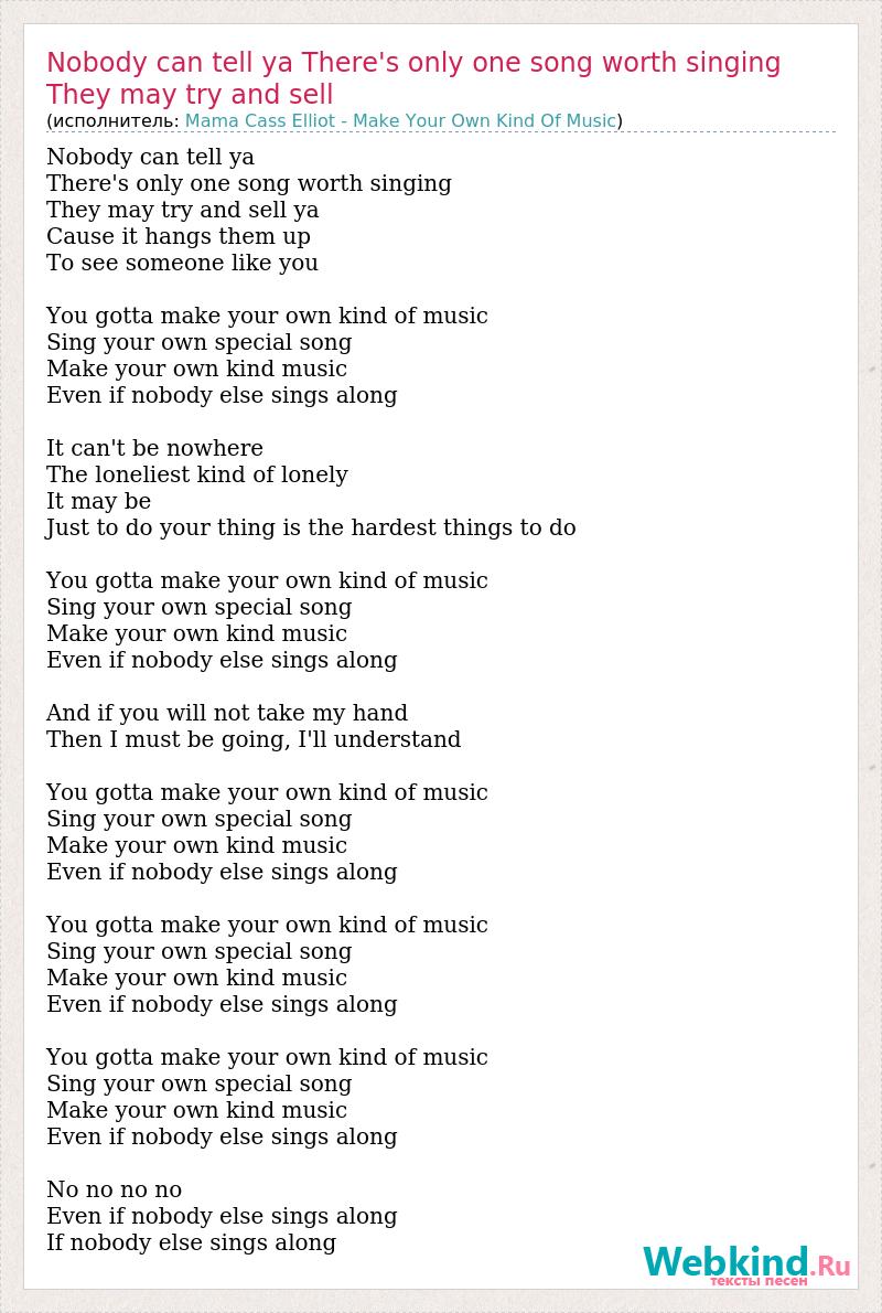 Nobody can tell ya There's only one song worth singing They may try and sell ya Cause it hangs them up To see someone like you You gotta make your own kind of music Sing your own special song Make your own kind music Even if nobody else sings along It can't be nowhere The loneliest kind of lonely It may be Just to do your thing is the hardest things to do You gotta make your own kind of music Sing your own special song Make your own kind music Even if nobody else sings along And if you will not take my hand Then I must be going, I'll understand You gotta make your own kind of music Sing your own special song Make your own kind music Even if nobody else sings along You gotta make your own kind of music Sing your own special song Make your own kind music Even if nobody else sings along You gotta make your own kind of music Sing your own special song Make your own kind music Even if nobody else sings along No no no no Even if nobody else sings along If nobody else sings along
