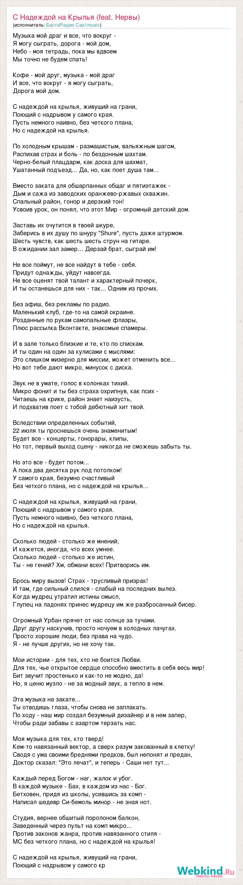 Музыка мой драг и все, что вокруг - Я могу сыграть, дорога - мой дом, Небо - моя тетрадь, пока мы вдвоем Мы точно не будем спать! Кофе - мой друг, музыка - мой драг И все, что вокруг - я могу сыграть, Дорога мой дом. С надеждой на крылья, живущий на грани, Поющий с надрывом у самого края. Пусть немного наивно, без четкого плана, Но с надеждой на крылья. По холодным крышам - размашистым, вальяжным шагом, Распихав страх и боль - по бездонным шахтам. Черно-белый плацдарм, как доска для шахмат, Ушатанный подъезд... Да, но, как поет душа там... Вместо заката для обшарпанных общаг и пятиэтажек - Дым и сажа из заводских оранжево-ржавых скважин. Спальный район, гонор и дерзкий тон! Усвоив урок, он понял, что этот Мир - огромный детский дом. Заставь их очутится в твоей шкуре, Заберись в их душу по шнуру "Shure", пусть даже штурмом. Шесть чувств, как шесть шесть струн на гитаре. В ожидании зал замер... Дерзай брат, сыграй им! Не все поймут, не все найдут в тебе - себя. Придут однажды, уйдут навсегда. Не все оценят твой талант и характерный почерк, И ты останешься для них - так... Одним из прочих. Без афиш, без рекламы по радио. Маленький клуб, где-то на самой окраине. Розданные по рукам самопальные флаэры, Плюс рассылка Вконтакте, знакомые спамеры. И в зале только близкие и те, кто по спискам. И ты один на один за кулисами с мыслями: Это слишком мизерно для миссии, может отменить все... Но вот тебе дают микро, минусок с диска. Звук не в умате, голос в колонках тихий. Микро фонит и ты без страха охрипнув, как псих - Читаешь на крике, район знает наизусть, И подхватив поет с тобой дебютный хит твой. Вследствии определенных событий, 22 июля ты проснешься очень знаменитым! Будет все - концерты, гонорары, клипы, Но тот, первый выход сцену - никогда не сможешь забыть ты. Но это все - будет потом... А пока два десятка рук под потолком! У самого края, безумно счастливый Без четкого плана, но с надеждой на крылья... С надеждой на крылья, живущий на грани, Поющий с надрывом у самого края. Пусть немного наивно, без четкого плана, Но с надеждой на крылья. Сколько людей - столько же мнений, И кажется, иногда, что всех умнее. Сколько людей - столько же истин, Ты - не гений? Хм, обмани всех! Притворись им. Брось миру вызов! Страх - трусливый призрак! И там, где сильный слился - слабый на последних вылез. Когда мудрец утратил истины смысл, Глупец на ладонях принес мудрецу им же разбросанный бисер. Огромный Урбан прячет от нас солнце за тучами. Друг другу наскучив, просто ночуем в холодных лачугах. Просто хорошие люди, без права на чудо. Я - не лучше других, но не хочу так. Мои истории - для тех, кто не боится Любви. Для тех, чье открытое сердце способно вместить в себя весь мир! Бит звучит простенько и как-то не модно, да! Но, я ценю музло - не за модный звук, а тепло в нем. Эта музыка на закате... Ты отводишь глаза, чтобы снова не заплакать. По ходу - наш мир создал безумный дизайнер и в нем запер, Чтобы ради забавы с азартом терзать нас. Моя музыка для тех, кто тверд! Кем-то навязанный вектор, а сверх разум закованный в клетку! Сводя с ума своими бреднями предков, был непонят и предан, Доктор сказал: "Это лечат", и теперь - Саши нет тут... Каждый перед Богом - наг, жалок и убог. В каждой музыке - Бах, в каждом из нас - Бог. Бетховен, придя из школы, усевшись за комп - Написал шедевр Си-бемоль минор - не зная нот. Студия, вернее обшитый поролоном балкон, Заведен