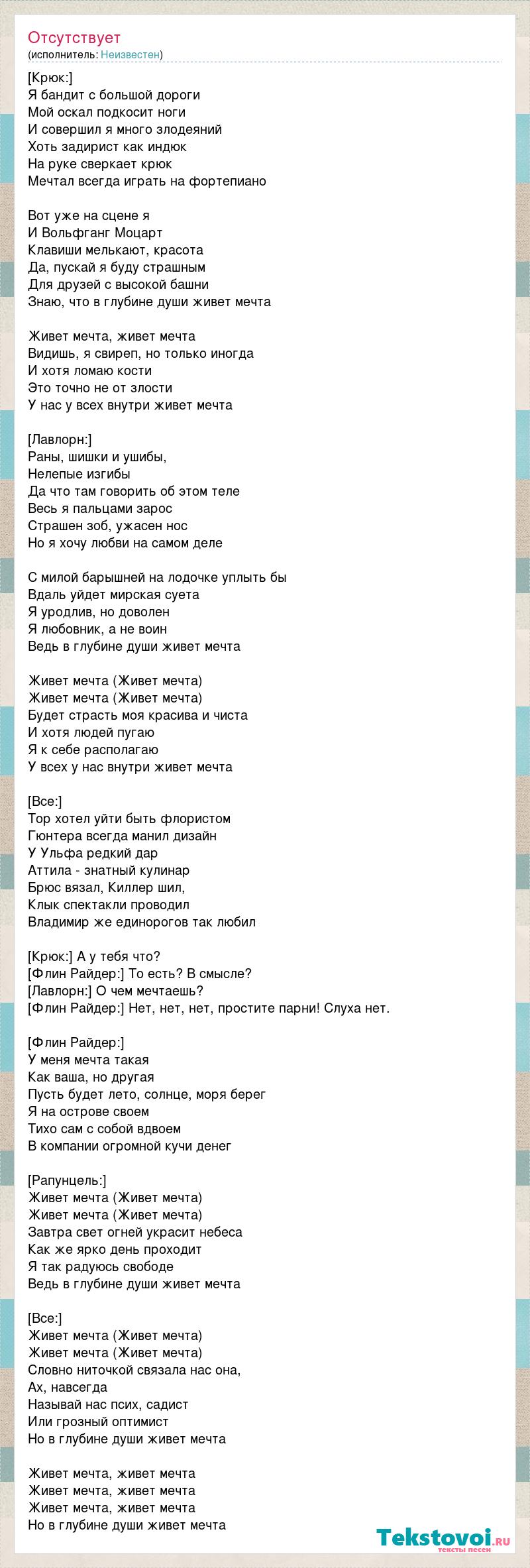[Крюк:] Я бандит с большой дороги Мой оскал подкосит ноги И совершил я много злодеяний Хоть задирист как индюк На руке сверкает крюк Мечтал всегда играть на фортепиано Вот уже на сцене я И Вольфганг Моцарт Клавиши мелькают, красота Да, пускай я буду страшным Для друзей с высокой башни Знаю, что в глубине души живет мечта Живет мечта, живет мечта Видишь, я свиреп, но только иногда И хотя ломаю кости Это точно не от злости У нас у всех внутри живет мечта [Лавлорн:] Раны, шишки и ушибы, Нелепые изгибы Да что там говорить об этом теле Весь я пальцами зарос Страшен зоб, ужасен нос Но я хочу любви на самом деле С милой барышней на лодочке уплыть бы Вдаль уйдет мирская суета Я уродлив, но доволен Я любовник, а не воин Ведь в глубине души живет мечта Живет мечта (Живет мечта) Живет мечта (Живет мечта) Будет страсть моя красива и чиста И хотя людей пугаю Я к себе располагаю У всех у нас внутри живет мечта [Все:] Тор хотел уйти быть флористом Гюнтера всегда манил дизайн У Ульфа редкий дар Аттила - знатный кулинар Брюс вязал, Киллер шил, Клык спектакли проводил Владимир же единорогов так любил [Крюк:] А у тебя что? [Флин Райдер:] То есть? В смысле? [Лавлорн:] О чем мечтаешь? [Флин Райдер:] Нет, нет, нет, простите парни! Слуха нет. [Флин Райдер:] У меня мечта такая Как ваша, но другая Пусть будет лето, солнце, моря берег Я на острове своем Тихо сам с собой вдвоем В компании огромной кучи денег [Рапунцель:] Живет мечта (Живет мечта) Живет мечта (Живет мечта) Завтра свет огней украсит небеса Как же ярко день проходит Я так радуюсь свободе Ведь в глубине души живет мечта [Все:] Живет мечта (Живет мечта) Живет мечта (Живет мечта) Словно ниточкой связала нас она, Ах, навсегда Называй нас псих, садист Или грозный оптимист Но в глубине души живет мечта Живет мечта, живет мечта Живет мечта, живет мечта Живет мечта, живет мечта Но в глубине души живет мечта