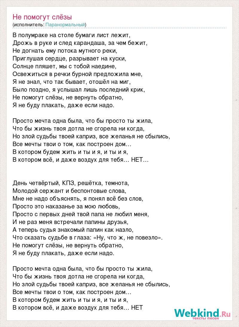 В полумраке на столе бумаги лист лежит, Дрожь в руке и след карандаша, за чем бежит, Не догнать ему потока мутного реки, Приглушая сердце, разрывает на куски, Солнце пляшет, мы с тобой наедине, Освежиться в речки бурной предложила мне, Я не знал, что так бывает, отошёл на миг, Было поздно, я услышал лишь последний крик, Не помогут слёзы, не вернуть обратно, Я не буду плакать, даже если надо. Просто мечта одна была, что бы просто ты жила, Что бы жизнь твоя дотла не сгорела ни когда, Но злой судьбы твоей каприз, все желанья не сбылись, Все мечты твои о том, как построен дом… В котором будем жить и ты и я, и ты и я, В котором всё, и даже воздух для тебя… НЕТ… День четвёртый, КПЗ, решётка, темнота, Молодой сержант и беспонтовые слова, Мне не надо объяснять, я понял всё без слов, Просто это наказанье за мою любовь, Просто с первых дней твой папа не любил меня, И не раз меня встречали папины друзья, А теперь судья знакомый папин как назло, Что сказать судьбе в глаза: «Ну, что ж, не повезло». Не помогут слёзы, не вернуть обратно, Я не буду плакать, даже если надо. Просто мечта одна была, что бы просто ты жила, Что бы жизнь твоя дотла не сгорела ни когда, Но злой судьбы твоей каприз, все желанья не сбылись, Все мечты твои о том, как построен дом… В котором будем жить и ты и я, и ты и я, В котором всё, и даже воздух для тебя… НЕТ