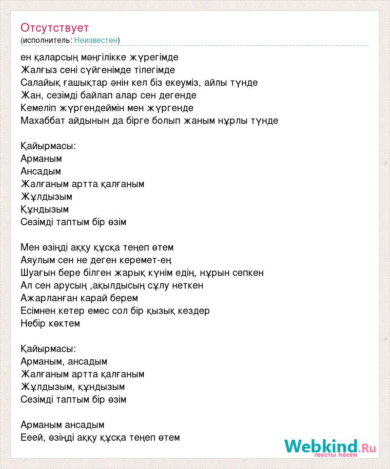 ен қаларсың мәңгілікке жүрегімде Жалғыз сені сүйгенімде тілегімде Салайық ғашықтар әнін кел біз екеуміз, айлы түнде Жан, сезімді байлап алар сен дегенде Кемеліп жүргендеймін мен жүргенде Махаббат айдынын да бірге болып жаным нұрлы түнде Қайырмасы: Арманым Ансадым Жалғаным артта қалғаным Жұлдызым Құндызым Сезімді таптым бір өзім Мен өзіңді аққу құсқа теңеп өтем Аяулым сен не деген керемет-ең Шуағын бере білген жарық күнім едің, нұрын сепкен Ал сен арусың ,ақылдысың сұлу неткен Ажарланған карай берем Есімнен кетер емес сол бір қызық кездер Небір көктем Қайырмасы: Арманым, ансадым Жалғаным артта қалғаным Жұлдызым, құндызым Сезімді таптым бір өзім Арманым ансадым Ееей, өзіңді аққу құсқа теңеп өтем