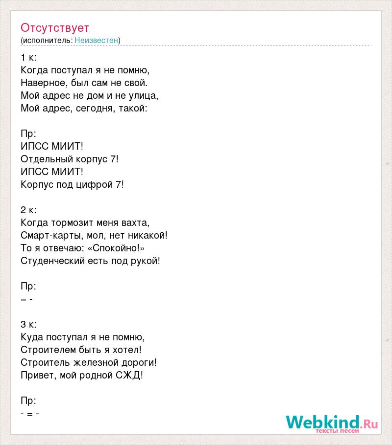 1 к: Когда поступал я не помню, Наверное, был сам не свой. Мой адрес не дом и не улица, Мой адрес, сегодня, такой: Пр: ИПСС МИИТ! Отдельный корпус 7! ИПСС МИИТ! Корпус под цифрой 7! 2 к: Когда тормозит меня вахта, Смарт-карты, мол, нет никакой! То я отвечаю: «Спокойно!» Студенческий есть под рукой! Пр: = - 3 к: Куда поступал я не помню, Строителем быть я хотел! Строитель железной дороги! Привет, мой родной СЖД! Пр: - = -