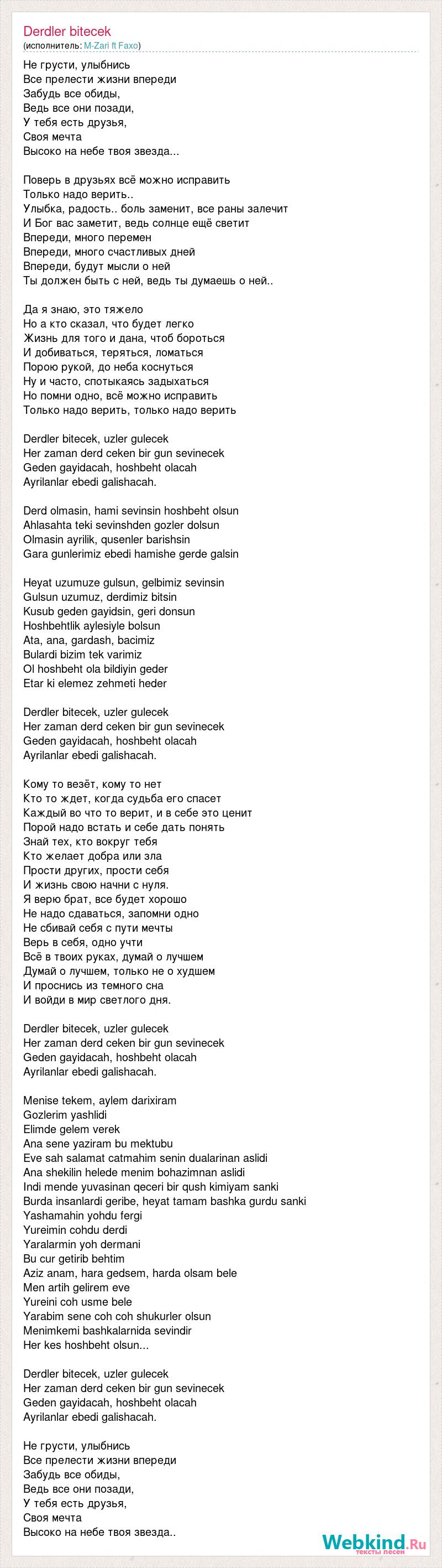 Не грусти, улыбнись Все прелести жизни впереди Забудь все обиды, Ведь все они позади, У тебя есть друзья, Своя мечта Высоко на небе твоя звезда... Поверь в друзьях всё можно исправить Только надо верить.. Улыбка, радость.. боль заменит, все раны залечит И Бог вас заметит, ведь солнце ещё светит Впереди, много перемен Впереди, много счастливых дней Впереди, будут мысли о ней Ты должен быть с ней, ведь ты думаешь о ней.. Да я знаю, это тяжело Но а кто сказал, что будет легко Жизнь для того и дана, чтоб бороться И добиваться, теряться, ломаться Порою рукой, до неба коснуться Ну и часто, спотыкаясь задыхаться Но помни одно, всё можно исправить Только надо верить, только надо верить Derdler bitecek, uzler gulecek Her zaman derd ceken bir gun sevinecek Geden gayidacah, hoshbeht olacah Ayrilanlar ebedi galishacah. Derd olmasin, hami sevinsin hoshbeht olsun Ahlasahta teki sevinshden gozler dolsun Olmasin ayrilik, qusenler barishsin Gara gunlerimiz ebedi hamishe gerde galsin Heyat uzumuze gulsun, gelbimiz sevinsin Gulsun uzumuz, derdimiz bitsin Kusub geden gayidsin, geri donsun Hoshbehtlik aylesiyle bolsun Ata, ana, gardash, bacimiz Bulardi bizim tek varimiz Ol hoshbeht ola bildiyin geder Etar ki elemez zehmeti heder Derdler bitecek, uzler gulecek Her zaman derd ceken bir gun sevinecek Geden gayidacah, hoshbeht olacah Ayrilanlar ebedi galishacah. Кому то везёт, кому то нет Кто то ждет, когда судьба его спасет Каждый во что то верит, и в себе это ценит Порой надо встать и себе дать понять Знай тех, кто вокруг тебя Кто желает добра или зла Прости других, прости себя И жизнь свою начни с нуля. Я верю брат, все будет хорошо Не надо сдаваться, запомни одно Не сбивай себя с пути мечты Верь в себя, одно учти Всё в твоих руках, думай о лучшем Думай о лучшем, только не о худшем И проснись из темного сна И войди в мир светлого дня. Derdler bitecek, uzler gulecek Her zaman derd ceken bir gun sevinecek Geden gayidacah, hoshbeht olacah Ayrilanlar ebedi galishacah. Menise tekem, aylem darixiram Gozlerim yashlidi Elimde gelem verek Ana sene yaziram bu mektubu Eve sah salamat catmahim senin dualarinan aslidi Ana shekilin helede menim bohazimnan aslidi Indi mende yuvasinan qeceri bir qush kimiyam sanki Burda insanlardi geribe, heyat tamam bashka gurdu sanki Yashamahin yohdu fergi Yureimin cohdu derdi Yaralarmin yoh dermani Bu cur getirib behtim Aziz anam, hara gedsem, harda olsam bele Men artih gelirem eve Yureini coh usme bele Yarabim sene coh coh shukurler olsun Menimkemi bashkalarnida sevindir Her kes hoshbeht olsun... Derdler bitecek, uzler gulecek Her zaman derd ceken bir gun sevinecek Geden gayidacah, hoshbeht olacah Ayrilanlar ebedi galishacah. Не грусти, улыбнись Все прелести жизни впереди Забудь все обиды, Ведь все они позади, У тебя есть друзья, Своя мечта Высоко на небе твоя звезда..