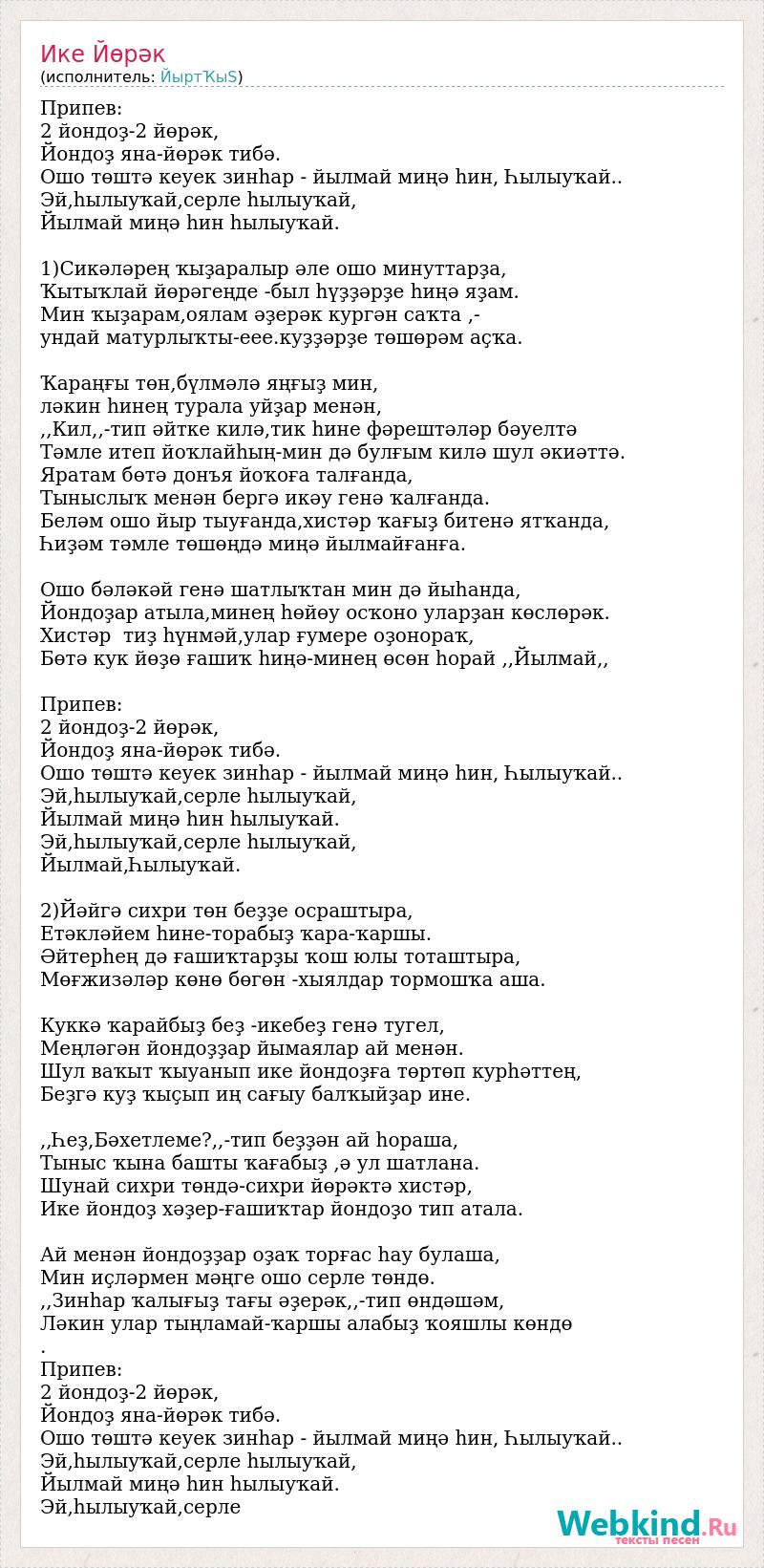 Припев: 2 йондоҙ-2 йөрәк, Йондоҙ яна-йөрәк тибә. Ошо төштә кеуек зинһар - йылмай миңә һин, Һылыуҡай.. Эй,һылыуҡай,серле һылыуҡай, Йылмай миңә һин һылыуҡай. 1)Сикәләрең ҡыҙаралыр әле ошо минуттарҙа, Ҡытыҡлай йөрәгеңде -был һүҙҙәрҙе һиңә яҙам. Мин ҡыҙарам,оялам әҙерәк кургән саҡта ,- ундай матурлыҡты-еее.куҙҙәрҙе төшөрәм аҫҡа. Ҡараңғы төн,бүлмәлә яңғыҙ мин, ләкин һинең турала уйҙар менән, ,,Кил,,-тип әйтке килә,тик һине фәрештәләр бәуелтә Тәмле итеп йоҡлайһың-мин дә булғым килә шул әкиәттә. Яратам бөтә донъя йоҡоға талғанда, Тыныслыҡ менән бергә икәу генә ҡалғанда. Беләм ошо йыр тыуғанда,хистәр ҡағыҙ битенә ятҡанда, Һиҙәм тәмле төшөңдә миңә йылмайғанға. Ошо бәләкәй генә шатлыҡтан мин дә йыһанда, Йондоҙар атыла,минең һөйөу осҡоно уларҙан көслөрәк. Хистәр тиҙ һүнмәй,улар ғумере оҙонораҡ, Бөтә кук йөҙө ғашиҡ һиңә-минең өсөн һорай ,,Йылмай,, Припев: 2 йондоҙ-2 йөрәк, Йондоҙ яна-йөрәк тибә. Ошо төштә кеуек зинһар - йылмай миңә һин, Һылыуҡай.. Эй,һылыуҡай,серле һылыуҡай, Йылмай миңә һин һылыуҡай. Эй,һылыуҡай,серле һылыуҡай, Йылмай,Һылыуҡай. 2)Йәйгә сихри төн беҙҙе осраштыра, Етәкләйем һине-торабыҙ ҡара-ҡаршы. Әйтерһең дә ғашиҡтарҙы ҡош юлы тоташтыра, Мөғжизәләр көнө бөгөн -хыялдар тормошҡа аша. Куккә ҡарайбыҙ беҙ -икебеҙ генә тугел, Меңләгән йондоҙҙар йымаялар ай менән. Шул ваҡыт ҡыуанып ике йондоҙға төртөп курһәттең, Беҙгә куҙ ҡыҫып иң сағыу балҡыйҙар ине. ,,Һеҙ,Бәхетлеме?,,-тип беҙҙән ай һораша, Тыныс ҡына башты ҡағабыҙ ,ә ул шатлана. Шунай сихри төндә-сихри йөрәктә хистәр, Ике йондоҙ хәҙер-ғашиҡтар йондоҙо тип атала. Ай менән йондоҙҙар оҙаҡ торғас һау булаша, Мин иҫләрмен мәңге ошо серле төндө. ,,Зинһар ҡалығыҙ тағы әҙерәк,,-тип өндәшәм, Ләкин улар тыңламай-ҡаршы алабыҙ ҡояшлы көндө . Припев: 2 йондоҙ-2 йөрәк, Йондоҙ яна-йөрәк тибә. Ошо төштә кеуек зинһар - йылмай миңә һин, Һылыуҡай.. Эй,һылыуҡай,серле һылыуҡай, Йылмай миңә һин һылыуҡай. Эй,һылыуҡай,серле