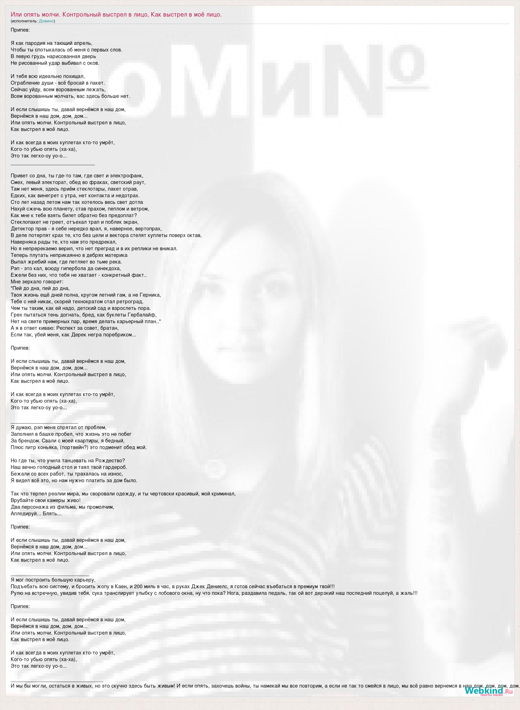Припев: Я как пародия на тающий апрель, Чтобы ты спотыкалась об меня с первых слов. В левую грудь нарисованная дверь Не рисованный удар выбивал с оков. И тебя всю идеально похищал, Ограбление души - всё бросай в пакет. Сейчас уйду, всем ворованным лежать, Всем ворованным молчать, вас здесь больше нет. И если слышишь ты, давай вернёмся в наш дом, Вернёмся в наш дом, дом, дом... Или опять молчи. Контрольный выстрел в лицо, Как выстрел в моё лицо. И как всегда в моих куплетах кто-то умрёт, Кого-то убью опять (ха-ха), Это так легко-оу уо-о... ______________________________ Привет со дна, ты где-то там, где свет и электрофанк, Смех, левый электорат, обед во фраках, светский раут, Там нет меня, здесь приём стеклотары, пакет отрав, Едких, как винегрет с утра, нет контакта и недотрах. Сто лет назад летом нам так хотелось весь свет дотла Нахуй сжечь всю планету, став прахом, пеплом и ветром, Как мне к тебе взять билет обратно без предоплат? Стеклопакет не греет, отъехал трап и поблек экран, Детектор прав - я себе нередко врал, я, наверное, вертопрах, В деле потерпят крах те, кто без цели и вектора стелят куплеты поверх октав, Наверняка рады те, кто нам это предрекал, Но я непререкаемо верил, что нет преград и в их реплики не вникал. Теперь плутать неприкаянно в дебрях материка Выпал жребий нам, где петляет во тьме река. Рэп - это кал, всюду гипербола да синекдоха, Ежели без них, что тебя не хватает - конкретный факт.. Мне зеркало говорит: "Пей до дна, пей до дна, Твоя жизнь ещё дней полна, кругом летний гам, а не Герника, Тебе с ней никак, скорей технократом стал ретроград, Чем ты таким, как ей надо, детский сад и взрослеть пора. Грех пытаться тень догнать, бред, как буклеты Гербалайф, Нет на свете примерных пар, время делать карьерный план.." А я в ответ киваю: Респект за совет, братан, Если так, убей меня, как Дерек негра поребриком... Припев: И если слышишь ты, давай вернёмся в наш дом, Вернёмся в наш дом, дом, дом... Или опять молчи. Контрольный выстрел в лицо, Как выстрел в моё лицо. И как всегда в моих куплетах кто-то умрёт, Кого-то убью опять (ха-ха), Это так легко-оу уо-о... ________________________ Я думаю, рэп меня спрятал от проблем, Заполнил в башке пробел, что жизнь это не побег За брендом. Свали с моей квартиры, я бедный, Плюс литр коньяка, (портвейн?) это подменит обед мой. Но где ты, что учила танцевать на Рождество? Наш вечно голодный стол и таял твой гардероб. Бежали со всех работ, ты трахалась на износ, Я видел всё это, но нам нужно платить за дом было. Так что терпел реалии мира, мы своровали одежду, и ты чертовски красивый, мой криминал, Врубайте свои камеры живо! Два персонажа из фильма, мы промолчим, Аплодируй... Блять... Припев: И если слышишь ты, давай вернёмся в наш дом, Вернёмся в наш дом, дом, дом... Или опять молчи. Контрольный выстрел в лицо, Как выстрел в моё лицо. ____________________________ Я мог построить большую карьеру, Подъебать всю систему, и бросить жопу в Каен, и 200 миль в час, в руках Джек Дениелс, я готов сейчас въебаться в премиум твой!!! Рулю на встречную, увидив тебя, сука транслирует улыбку с лобового окна, ну что пока? Нога, раздавила педаль, так ой вот дерзкий наш последний поцелуй, а жаль!!! Припев: И если слышишь ты, давай вернёмся в наш дом, Вернёмся в наш дом, дом, дом... Или опять молчи. Контрольный выстрел в лицо, Как выстрел в моё лицо. И как всегда в моих куплетах кто-то умрёт, Кого-то убью опять (ха-ха), Это так легко-оу 